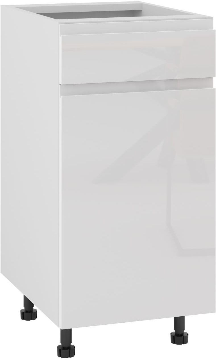 RIMINI SZAFKA DOLNA PRAWA D1S-40_MODERN BIAŁY POŁYSK to produkt, który zachwyci każdego swoim wyglądem. Jego wymiary: głębokość to 53 cm, szerokość to 40 cm, a wysokość to 82 cm. Posiada jedną szufladę oraz pojedyncze drzwiczki. Te dwa elementy zostały wyposażone w cichy domyk i frezowane uchwyty. Korpus RIMINI SZAFKI DOLNEJ w białym kolorze został wyprodukowany z płyty laminowanej, a białe fronty z połyskiem z MDFu lakierowanego. Takie połączenie materiałów sprawia, że produkt nie ulega łatwo uszkodzeniom mechanicznym, więc długo posłuży. RIMINI SZAFKA DOLNA PRAWA D1S-40_ MODERN BIAŁY POŁYSK jest przystosowana do samodzielnego montażu.