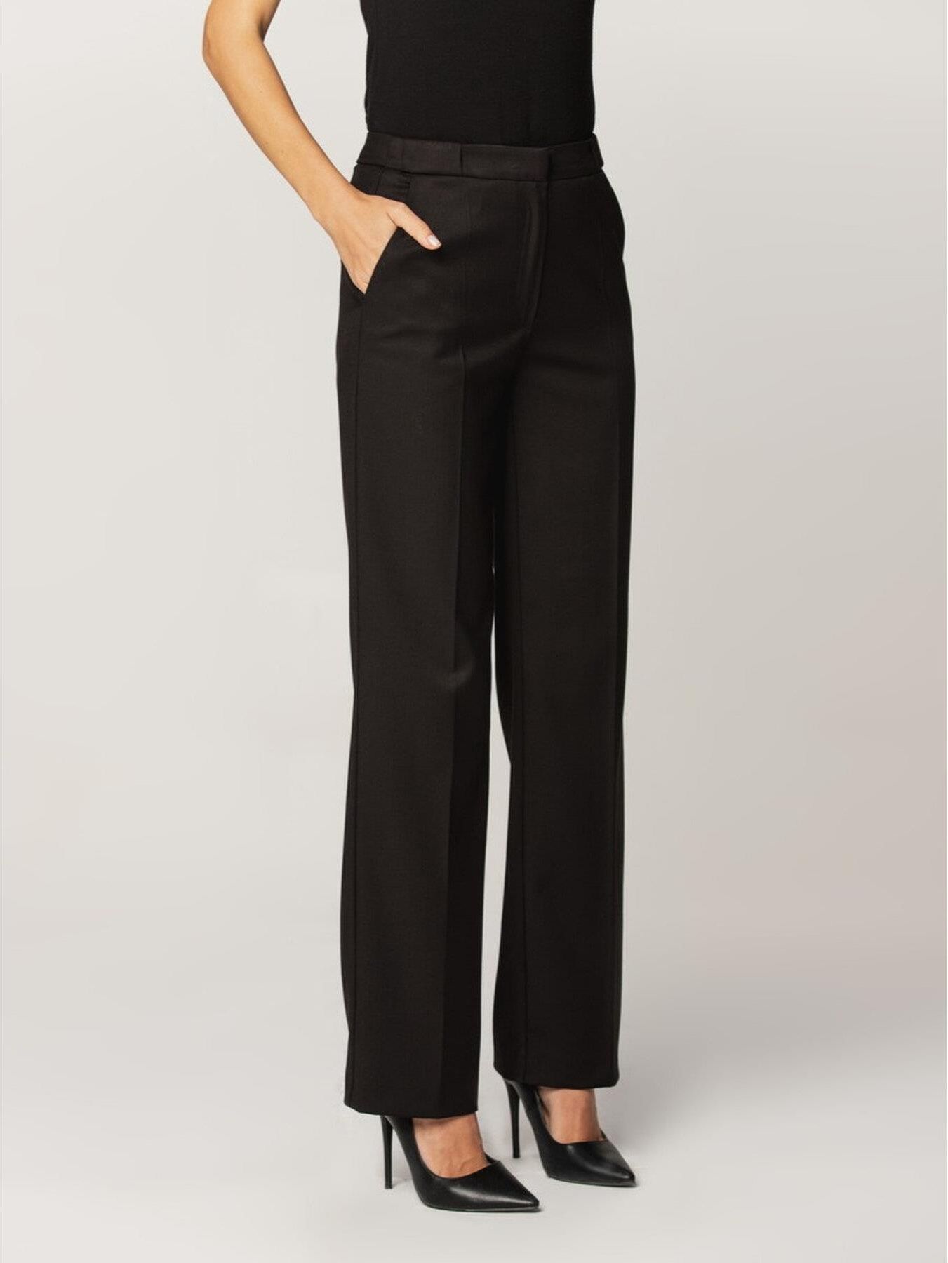 Klasyczne czarne spodnie garniturowe typu Long Size o prostym fasonie z zaprasowanymi kantami