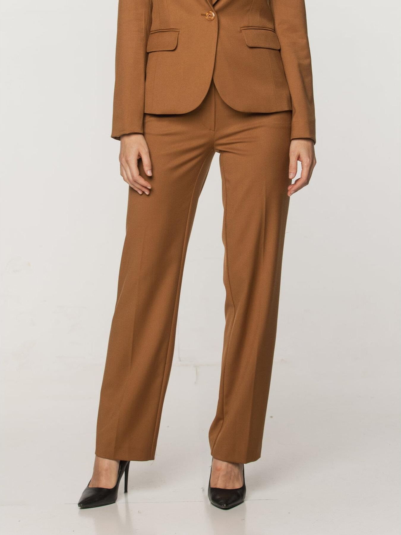 Klasyczne, brązowe spodnie garniturowe o gładkiej fakturze i prostym fasonie, z zaprasowanymi kantami