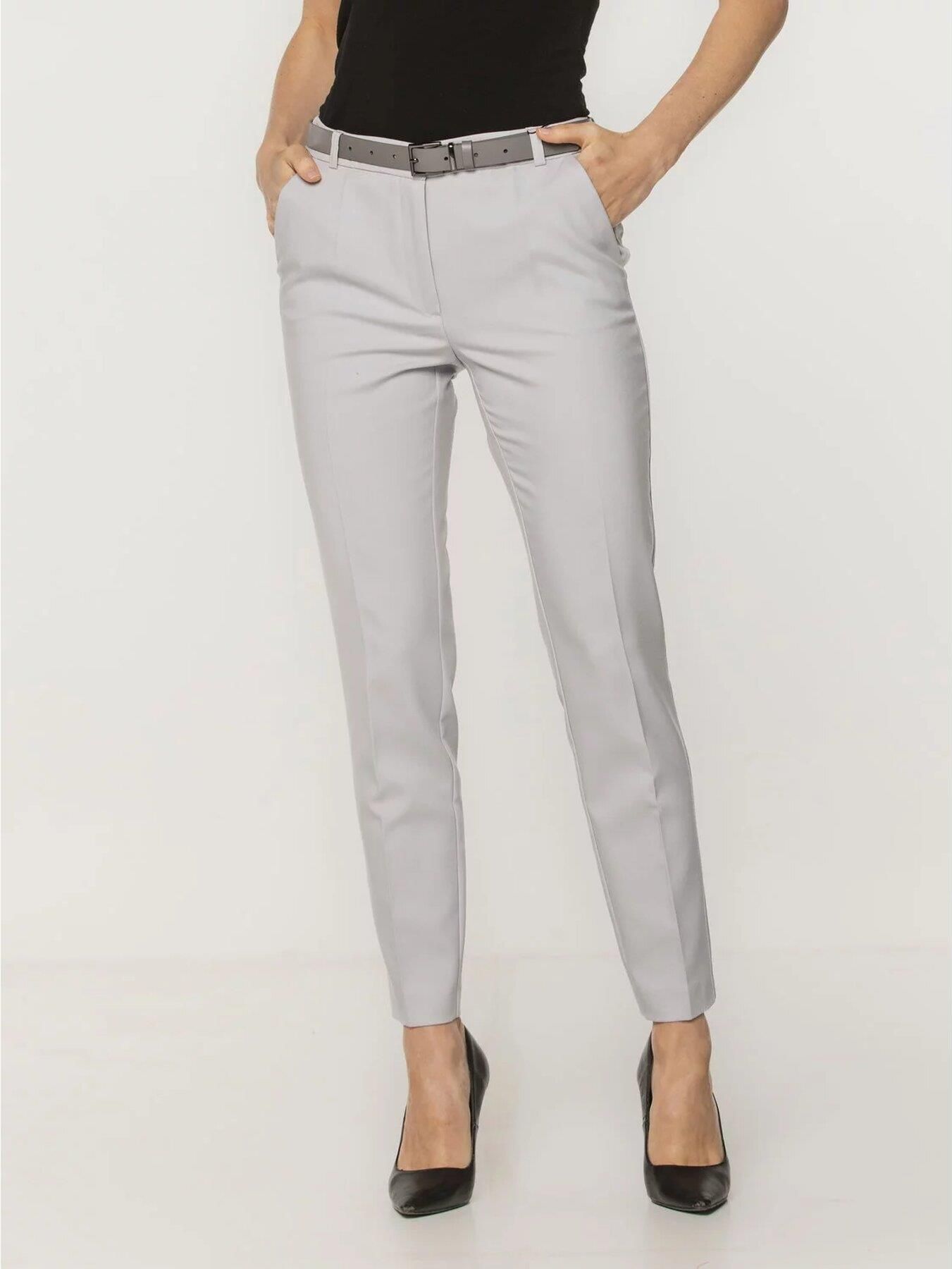 Klasyczne, jasnoszare spodnie garniturowe o gładkiej fakturze z zaprasowanymi kantami i zwężanymi nogawkami