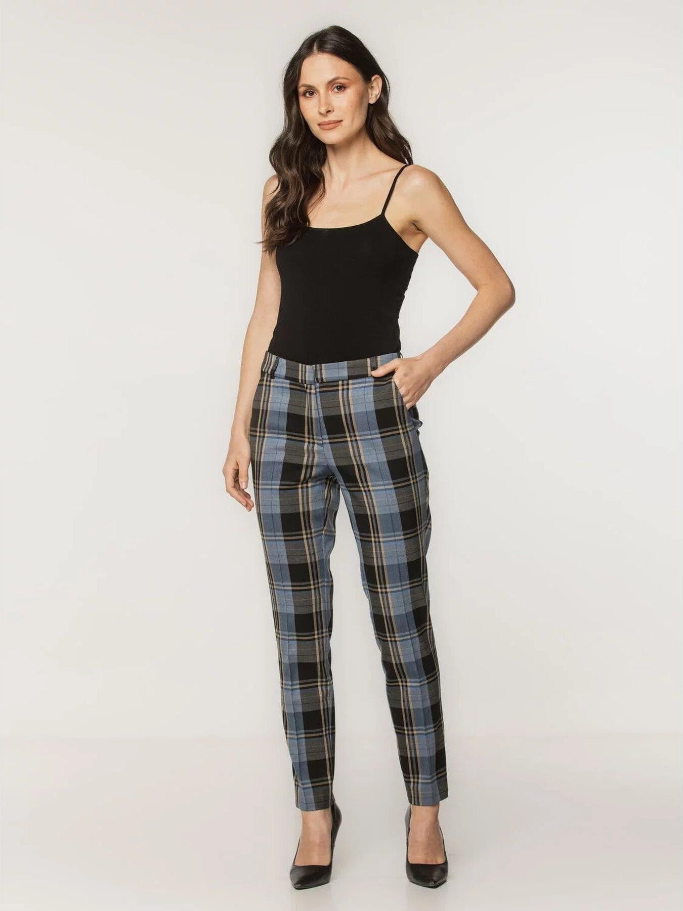 Klasyczne, niebieskie spodnie garniturowe w czarną i żółtą kratę z zaprasowanymi kantami i zwężanymi nogawkami