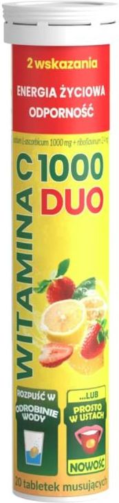 Witamina C 1000 DUO z Ryboflawiną 20 tabletek Podstawowe informacje o Witamina C 1000 DUO z Ryboflawiną Witamina C 1000 DUO z Ryboflawiną to 100% składników pochodzenia naturalnego lub biotechnologicznego. Suplement diety przeznaczony jest dla osób dorosłych. Działanie i właściwości Witamina C skutecznie wspiera odporność, a ponadto jest skutecznym przeciwutleniaczem, zwalcza wolne rodniki i poprawia pracę układu krążenia. Witamina C 1000 DUO z Ryboflawiną dzięki zawartym składnikom dodatkowo wspomaga zdrowie: śluzówki, dziąseł, zębów. Zastosowanie / wskazania Witamina C 1000 DUO z Ryboflawiną rekomendowana jest dla osób chcących wesprzeć swoją odporność organizmu, poprawić energię życiową oraz w stanach zwiększonego zapotrzebowania na witaminę C i ryboflawinę. Składniki kwas L-askorbinowy (witamina C); regulatory kwasowości: wodorowęglan sodu, kwas cytrynowy; naturalny aromat pomarańczowych cytryn (127,2 mg); naturalny aromat truskawkowy (3,6 mg); substancja słodząca: glikozydy stewiolowe; ryboflawina. Zawiera źródło fenyloalaniny. Zawartość substancji charakteryzujących produkt w zalecanej do spożycia dziennej porcji dziennej (1 tabl.) : witamina C – 1000 mg ( 1250%); witamina B2 – 2,4 mg (170%). ( % realizacji referencyjnych wartości spożycia RWS) Witamina C 1000 DUO z Ryboflawiną - dawkowanie Spożywać 1 tabletkę dziennie. Witamina C 1000 DUO z Ryboflawiną - sposób spożycia Tabletki musujące do rozpuszczania w wodzie lub bezpośrednio w ustach.Możliwość rozpuszczania w ustach jest dużą wartością dodaną, gdyż składniki preparatu mają szybki, bezpośredni i długotrwały kontakt ze śluzówką, dziąsłami i zębami. Przeciwwskazania Nie stosować w kamicy nerkowej. Nie stosować w przypadku uczulenia na którykolwiek ze składników. Działania niepożądane / skutki uboczne Brak informacji dotyczących skutków ubocznych czy działań niepożądanych. Ostrzeżenia dotyczące bezpieczeństwa Nie należy przekraczać zalecanej porcji do spożycia w ciągu dnia. Produkt dla dorosłych. Spożywanie produktu przez kobiety w ciąży i karmiące piersią tylko pod nadzorem lekarza. Produkt nie może być stosowany jako substytut (zamiennik) zróżnicowanej diety. Zrównoważony sposób żywienia oraz zdrowy tryb życia są podstawą prawidłowego funkcjonowania organizmu. Ze względu na zawartość witaminy C nie stosować u osób mających predyspozycje do tworzenia kamieni nerkowych lub chorujących na kamicę nerkową. Warunki przechowywania: Przechowywać w szczelnie zamkniętym opakowaniu, w temperaturze pokojowej, w suchym miejscu, w sposób niedostępny dla małych dzieci. Chronić przed światłem. Witamina C 1000 DUO z Ryboflawiną a ciąża i karmienie piersią W okresie ciąży i karmienia piersią przed zastosowaniem produktu należy skonsultować się z lekarzem lub farmaceutą. Przechowywanie Preparat należy chronić przed bezpośrednim światłem, przechowywać w suchym miejscu, w oryginalnym opakowaniu, w temperaturze poniżej 25°C w sposób niedostępny dla małych dzieci. Opakowanie 20 tabletek