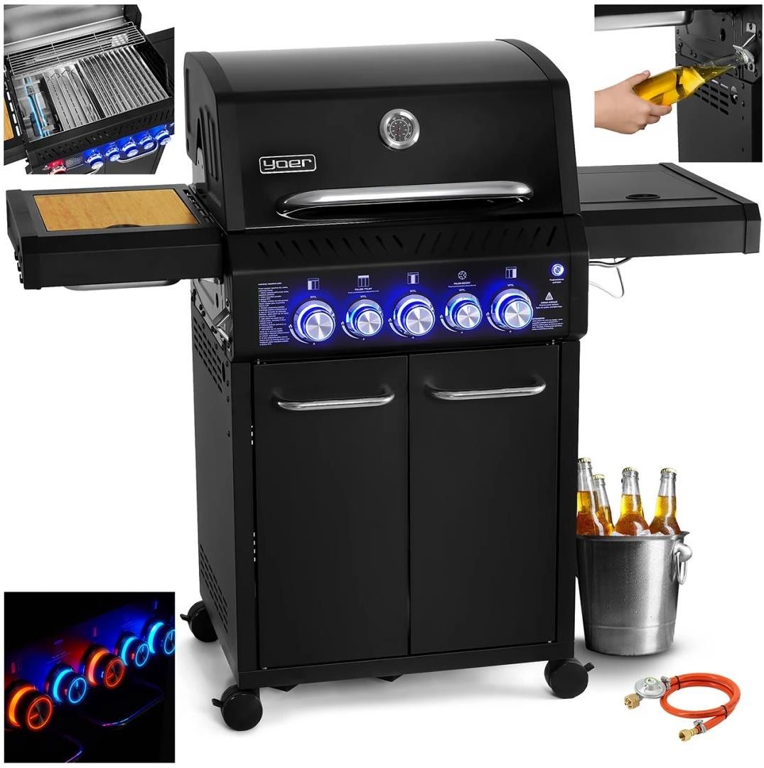 Grill gazowy Yoer BeefMaster GG06BK 3+2 FullHeatGrid - równomierne grillowanie na całej powierzchni GlowKnob - podświetlane pokrętła FlameZone - 3543,5 cm² - duża powierzchnia grillowania SpitFlame - dodatkowy palnik tylny do rożna CECHY PRODUKTU Grillowanie z butlą gazową wewnątrz grilla - …