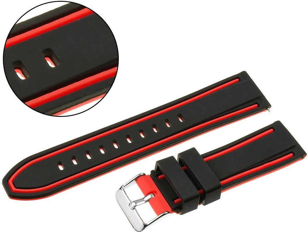 Silikonowy pasek do zegarka Pasuje do modelu SmartWatch oraz zegarków kwarcowych, gdzie szerokość mocowania paska wynosi 24 mm Pasek silikonowy U14. Klamerka stalowa w kolorze srebrnym. Materiał: Tworzywo. Kolorystyka: Kolor czarno-czerwony. Wymiary: szerokość mocowania: 24 mm szerokość przy kopercie: 24 mm długość części z klamerką: 89 mm długość części z dziurkami: 125 mm