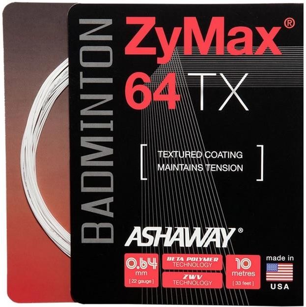 Ashaway ZyMax 64 TX - naciąg do badmintona składającyc się z rdzenia z włokien polimeru BETA ZyWeaVE otoczonego powierzchnią BETA o zwiększonej wytrzymałości na rozciąganie. Całość następnie otacza chropowata, teksturowa powłoka. Taka konstrukcja zapewnia strunom optymalną wytrzymałość i trwałość. Wielowóknista budowa zwiększa sprężystość naciągu co przekłada się na większą siłę dynamiczną, podczas gdy chropowata powierzchnia pozwala na lepszą kontrolę lotki. Średnica 0,64 mm to połączenie mocy i wydajności. Długość: 10 m, Grubość: 0,64 mm, Kolor: biały, max siła: ≥14,5 kg.