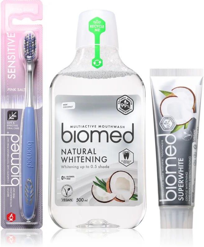 Biomed Superwhite Set, 1 szt., do wzmocnienia szkliwa unisex, Zestaw wybielający Biomed Superwhite Set pomoże łatwo i szybko uzyskać promienny uśmiech. Zawartość zestawu: Biomed Natural Whitening płyn do płukania ust 500 ml Biomed Pink Salt szczoteczka do zębów 1 szt. Biomed Superwhite wzmacniająca pasta do zębów Z olejkiem kokosowym. 100 g Właściwości: ma działania kojące gwarantuje delikatną pielęgnację zębów i dziąseł wspomaga wybielanie zębów ogranicza powstawanie osadu zębnego zapewnia świeży oddech wzmacnia szkliwo zębów pozostawia w ustach uczucie czystości i świeżości bardzo miękkie włosie Skład: produkt wegański co najmniej 97% składników pochodzenia naturalnego Sposób użycia: Nanieś na szczoteczkę pastę do zębów, zwilż, wyczyść zęby i jamę ustną. Dokładnie wypłucz. Po wyczyszczeniu zębów przepłucz usta płynem do płukania jamy ustnej przez tyle czasu, ile podano na opakowaniu, a potem wypluj.