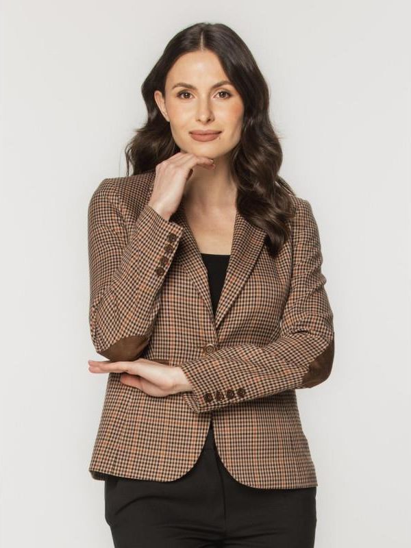 Marynarka damska w pepitkę Wybierając elegancką, jednorzędową marynarkę damską marki Willsoor bez wątpienia przekonasz się do noszenia jej nie tylko od święta, ale również na co dzień! Marynarka jest lekka i wygodna, dzięki czemu nawet nie poczujesz, że masz na sobie tak niebywale elegancki strój. Została uszyta z wysokiej jakości materiału, który jest elastyczny i delikatny w dotyku. Krój wyraźnie podkreśla linię talii. Guziki oraz kieszenie z patkami stylowo uzupełniają nowoczesny design marynarki. Skład tkaniny: 64% poliester, 34% wiskoza, 2% elastan Skład podszewki: 94% poliester, 6% elastan Rodzaj marynarki: jednorzędowa, zapinana na jeden guzik Kolor główny: brązowa w czarną pepitkę i pomarańczową kratę Wykończenia: brązowe nałokietniki, obszycia kieszeni i guziki Producent: Willsoor Gwarancja: 24 m-ce Uszyta w Polsce