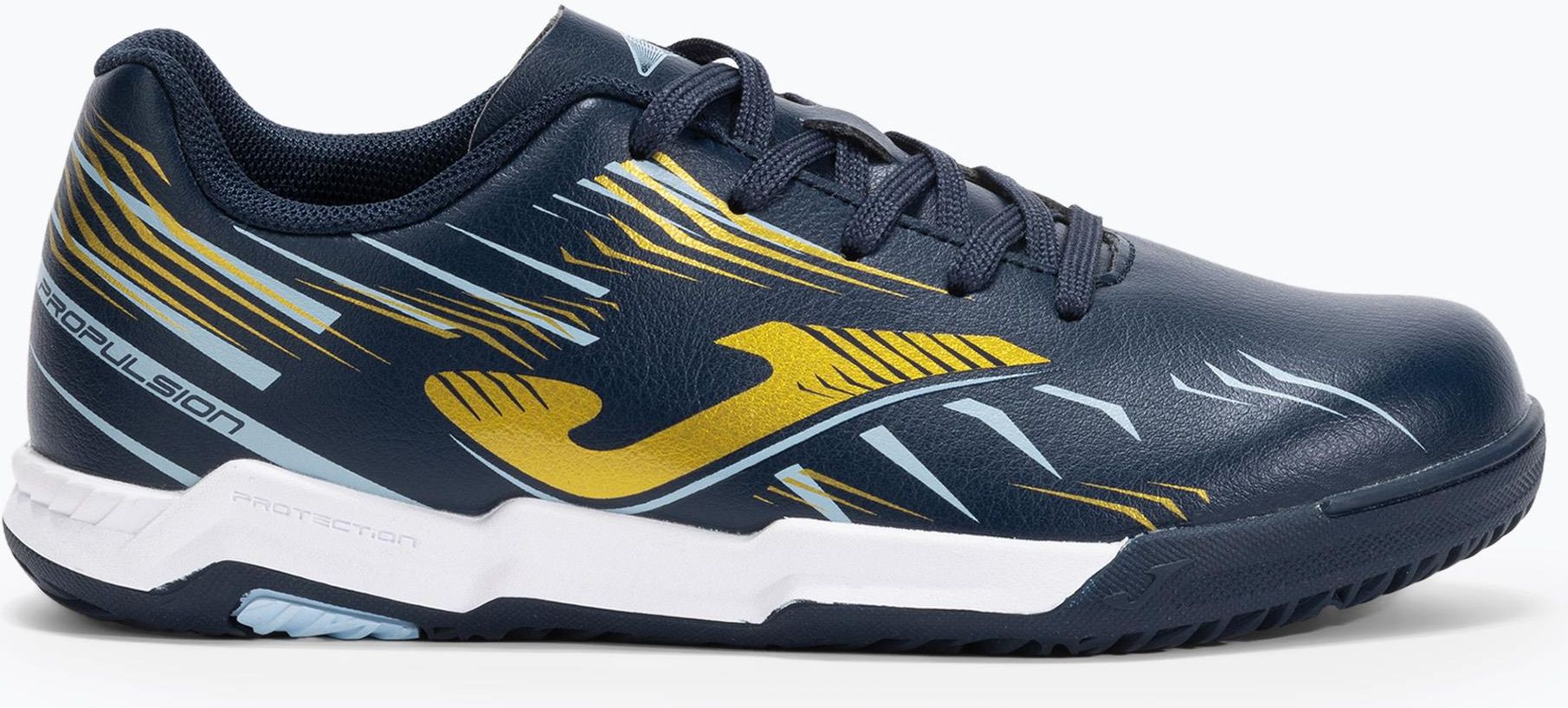 Buty piłkarskie dziecięce Joma Propulsion Jr IN navy blue to doskonały wybór dla młodych piłkarzy grających w halowych warunkach. Dzięki niebrudzącej podeszwie gumowej, obuwie sprawdzi się na różnego rodzaju nawierzchniach halowych, nie pozostawiając śladów. Syntetyczna cholewka zapewnia odpowiednią wytrzymałość i lekkość, co przekłada się na komfort użytkowania podczas intensywnych treningów i meczów. Technologia Durability Buty piłkarskie dziecięce Joma Propulsion Jr IN navy blue są wyposażone w technologię Durability, która zwiększa trwałość obuwia. Dzięki tej innowacji buty stają się bardziej odporne na ścieranie, co jest szczególnie istotne podczas dynamicznej gry na hali. Technologia ta przedłuża żywotność obuwia, zapewniając jednocześnie ochronę i komfort dla stóp młodych sportowców. Komfort i dopasowanie Buty piłkarskie dziecięce Joma Propulsion Jr IN navy blue posiadają klasyczne sznurowanie, które umożliwia precyzyjne dopasowanie obuwia do stopy. To rozwiązanie zapewnia stabilność i pewność ruchów w trakcie gry. Dzieci mogą cieszyć się pełną swobodą ruchu i doskonałym czuciem piłki, co przekłada się na lepszą kontrolę i efektywność na boisku. Buty piłkarskie dziecięce Joma Propulsion Jr IN - cechy: Dedykowane do gry na halowych nawierzchniach; Niebrudząca podeszwa gumowa zapobiegająca pozostawianiu śladów; Syntetyczna cholewka zapewniająca lekkość i wytrzymałość; Technologia Durability zwiększająca odporność na ścieranie; Klasyczne sznurowanie dla precyzyjnego dopasowania; Zwiększona stabilność i pewność ruchów dzięki klasycznemu sznurowaniu; Doskonałe czucie piłki dla lepszej kontroli na boisku.