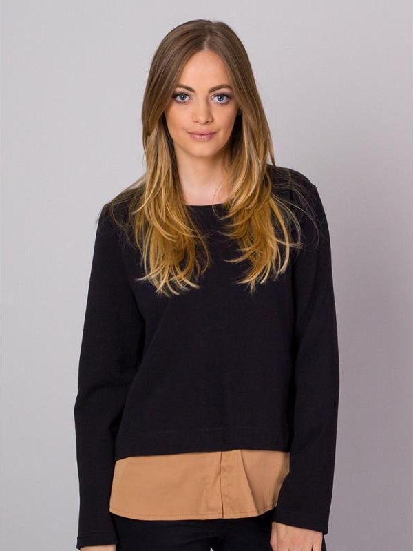 Czarna bluzka damska dzianinowa z doszytą, wystającą koszulą w brązowym kolorze