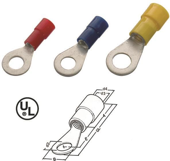 HAUPA - Końcówki oczkowe izolowane 100 szt. - niebieskie Końcówki wykonane z miedzi elektrolicznej poddanej cynowaniu. Izolowane w PVC z przedłużoną końcóką izolującą. Przystosowane do przewodów zespolonych. WYMIARY: Przekrój przewodu: 1,5-2,5mm² Długość całkowita: 33mm Gwint: M8