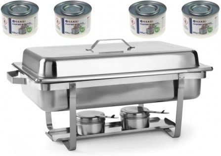 Podgrzewacz do potraw GN 1/1 HENDI na pastę + 4 pasty o gramaturze 200g każda. Urządzenie do podgrzewania i utrzymywania ciepła potraw Urządzenie do podgrzewania potraw dedykowane jest dla branży hotelarskiej, gastronomicznej oraz cateringowej. Stosując profesjonalny, gastronomiczny podgrzewacz do potraw HENDI można przez długi czas utrzymać świeżość i ciepło posiłków. Dzięki mechanizmowi znanemu z garnków do mleka (podwójne dno z płaszczem wodnym) potrawy nigdy się nie przypalą. Podgrzewanie Dzięki dwóm pojemnikom na pastę umieszczonym pod zbiornikiem z wodą dostajemy możliwość podgrzewania potraw.Podgrzewacz dzięki niewielkim rozmiarom możemy w łatwy sposób przenosić, dzięki czemu idealnie sprawdzi się podczas imprez okolicznościowych pod gołym niebem. Wykonanie Podgrzewacz w całości wykonany jest ze stali szlachetnej, dzięki czemu jest skutecznie chroniony przed korozją. Do tego możliwość rozłożenia na mniejsze elementy dodatkowo ułatwia nam czyszczenie.Zestaw zawiera pojemnik GN 1/1 o głębokości 65 mm, oraz pokrywę, która zatrzymuję ciepło i chroni potrawy przed dostaniem się zanieczyszczeń z zewnątrz. Istnieje również możliwość ustawienia pokrywy w pozycji półotwartej. Niewielka waga – 3,9 kg i kompaktowe wymiary: 620 x 350 x 310 mm pozwalają nam wygodnie transportować i przechowywać urządzenie. Specyfikacja produktu Nr katalogowy H475904 Artykuł Podgrzewacz Stan artykułu Nowy Obudowa Stal nierdzewna Wymiary zewnętrzne pojemnika na wodę (DxSxW) 550 x 350 x 100 mm Wymiary stelaża (DxSxW) 620 x 325 x 210 mm Pojemność 9 l Długość 620 mm Szerokość 350 mm Wysokość 310 mm Waga 3,9 kg Wielkość paczki (DxSxW) 620 x 370 x 225 mm Waga paczki 5 kg W skład zestawu wchodzą: Pojemnik GN 1/1 4 pasty 200g Stelaż Pojemnik na wodę 2 x pojemnik na pastę Dowód zakupu - paragon/faktura VAT Instrukcja obsługi Gwarancja