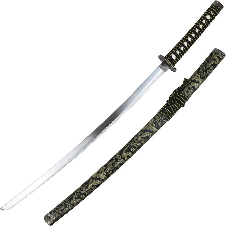Katana HATTORI HANZO Nero HH029 Nero – stylowa replika miecza samurajskiego dla kolekcjonerów i pasjonatów Japonii Katana HATTORI HANZO Nero HH029 to efektownie wykonana replika inspirowana legendarnymi japońskimi mieczami samurajskimi. Model ten łączy w sobie klasyczną sylwetkę katany z elegancką, ozdobną stylistyką, dzięki czemu stanowi doskonały element dekoracyjny do domu, biura, gabinetu czy sali treningowej. Wyrazista, dekoracyjna stylistyka Miecz wyróżnia się czarną pochwą pokrytą subtelnym, złotym wzorem smoków – motywem silnie zakorzenionym w kulturze Wschodu, symbolizującym siłę, energię i opiekę. Tradycyjny oplot rękojeści w kontrastujących barwach dodaje całości autentycznego charakteru, idealnie dopełniając wygląd repliki. Klasyczna konstrukcja samurajskiego miecza Katana posiada wszystkie typowe elementy konstrukcyjne: * Drewniana pochwa (saya) – lekka, zdobiona i starannie lakierowana. * Drewniana rękojeść (tsuka) – opleciona dekoracyjnym sznurowaniem, zapewniającym wygodny chwyt podczas prezentacji. * Metalowa tsuba – ozdobna gardę, nadająca replice odpowiednią stabilność i realistyczny wygląd. Ostrze wykonane zostało z metalu i posiada delikatnie zaznaczoną linię hartowania (hamon), co podkreśla dekoracyjny charakter miecza. Zastosowanie typowo ozdobne Katana HATTORI HANZO Nero HH029 nie jest bronią – ostrze pozostaje niezostrzone i tępe, dzięki czemu produkt przeznaczony jest wyłącznie do celów dekoracyjnych. Idealnie sprawdzi się: - jako element kolekcji, - jako ozdoba wnętrza, - jako rekwizyt fotograficzny lub wystawowy, - jako prezent dla miłośników kultury japońskiej i filmów samurajskich. - Całkowita długość: 930 mm - Długość z pochwą: 1000 mm - Długość ostrza: 660 mm - Waga: 635 g (860 g z pochwą) - Materiały: drewno (pochwa, rękojeść), metal (ostrze, tsuba)