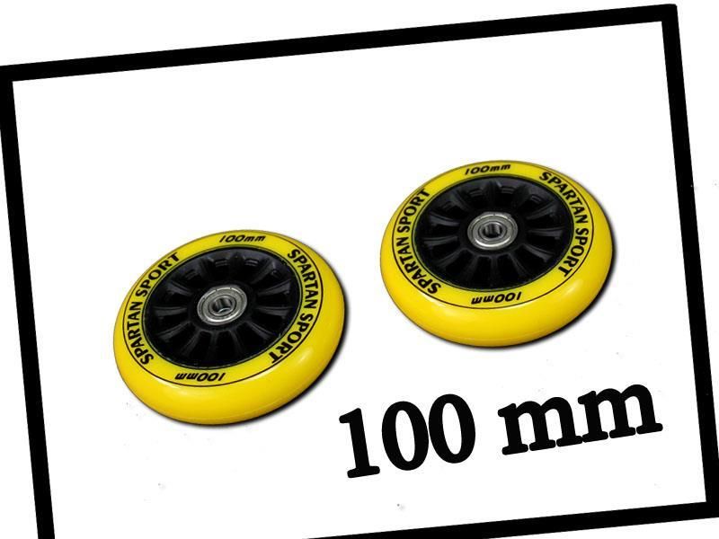 Kółka austriackiej firmy SPARTAN stosowane w hulajnogach wyczynowych zostały wykonane z wytrzymałego materiału PU (poliuretan/kauczuk). Średnica kółek (100 mm) jak i ich twardość (85A) są idealnie dostosowane do Hulajnogi wyczynowej. Średnica kółek wpływa bezpośrednio na szybkość i komfort jazdy. Twardość decyduje o przyczepności do podłoża po którym się poruszamy. Dodatkowo w zestawie znajdują się łożyska ABEC 7 w kolorze srebrnym - ABEC 7 to najwyższa klasa łożysk. Kołka w głównej mierze przeznaczone do Hulajnóg wyczynowych.