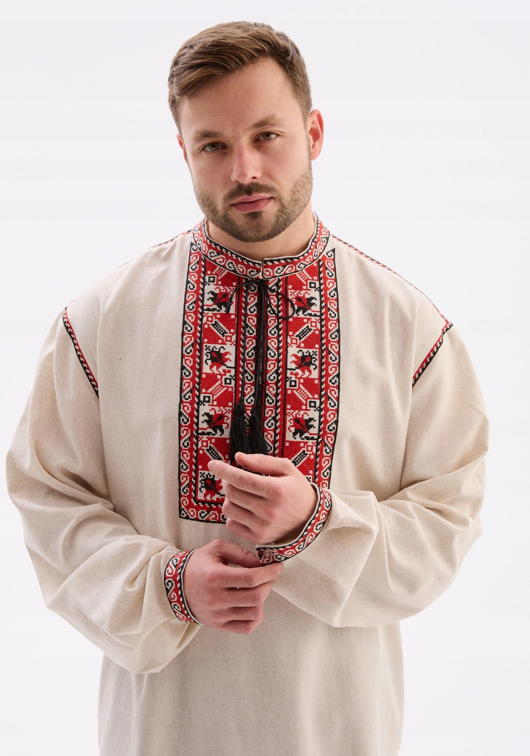 Wyszywanka Picasso to wyjątkowe połączenie Słowiańskich tradycji i światowej sztuki. Zainspirowany historią legendarnego artysty XX wieku, Pabla Picassa, który nosił haftowaną koszulę podarowaną mu przez jego pierwszą żonę, Ukrainkę Olgę Chochłową, model ten oddaje ducha kultury i stylu, uderzając głęboką symboliką. Projekt koszuli skupia się na luksusowym hafcie na klatce piersiowej i wzdłuż linii ramion, wykonanym w odcieniach czerwieni i czerni techniką węzła francuskiego. Ozdoba wyróżnia się unikatowym stylem, który dodaje produktowi autentyczności i wyrazistości. Naturalna tkanina lniana w odcieniu beżu zapewnia komfort i naturalny wygląd. Pierwszą rzeczą, która przykuwa uwagę w tym wzorze, są klucze, jako symbol nowych możliwości, wiedzy duchowej i ukrytych drzwi do szczęścia. Uzupełnieniem jest chmiel, będący symbolem energii, witalności i młodości. A kwadrat jest uosobieniem stabilności, równowagi i harmonii. Ta koszula to idealny wybór dla mężczyzn ceniących historię, niepowtarzalny design i głęboką symbolikę. Świetnie sprawdzi się na specjalne okazje, jak i na co dzień, dodając Twojej garderobie charakteru i treści. Wyjątkowa mieszanka naturalnych tkanin: 55% bawełna, 45% len. Rozmiar UA/EU, Szerokość w piersiach, Szerokość ramion, Długość rękawa, Długość wyrobu 46 (S), 58, 50, 66, 78 48 (M), 61, 51, 67, 78 50 (L), 63, 52, 68, 79 52 (XL), 65, 54, 69, 80 54 (2XL), 67, 56, 70, 81 56 (3XL), 70, 56, 71, 81 Zapraszam serdecznie.