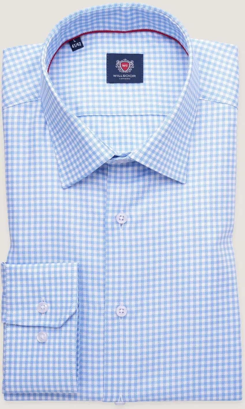 Błękitna, taliowana koszula w drobną kratkę z klasycznym kołnierzykiem, 100% bawełna
