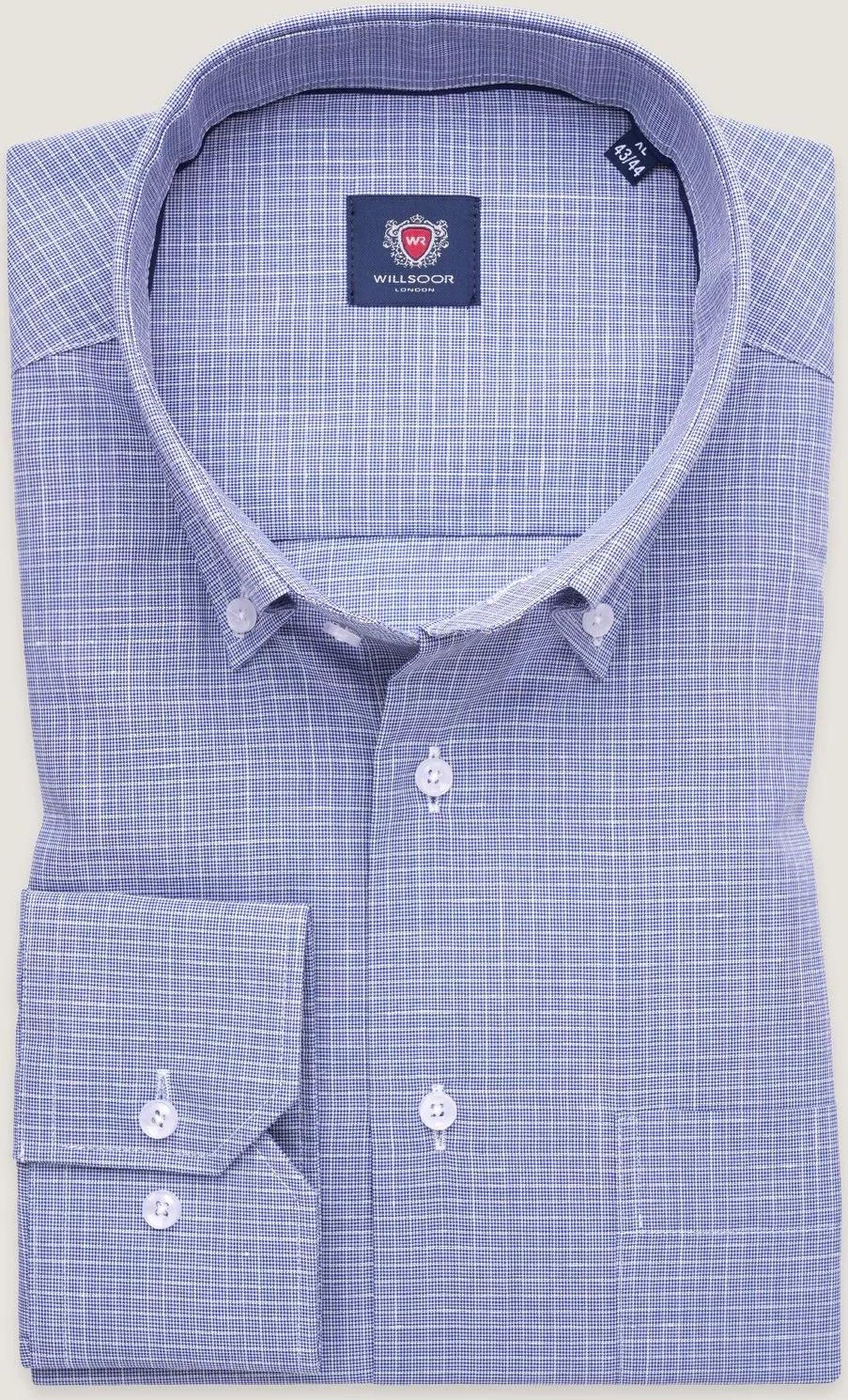 Niebieska, klasyczna koszula w delikatną, białą kratkę z podpinanym kołnierzykiem i kontrastowymi guzikami, 100% bawełna