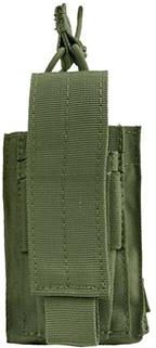 Ładownica Kangaroo Mag Pouch Gen II na jeden magazynek do M4/AR15 i jeden dwurzędowy do pistoletu. Magazynek do M4/AR15 przed wypadnięciem jest zabezpieczony elastyczną linką a magazynek pistoletowy klapą z rzepem. W obu ładownicach na dnie umieszczono otwory drenażowe. Ładownicę montuję się przy użyciu troków zgodnych z systemem MOLLE Cechy: Ładownica na jeden magazynek AR i jeden pistoletowy Każdy magazynek posiada osobną kieszeń Otwory drenażowe w dnie każdej kieszeni Magazynki zabezpieczone przed wypadnięciem przez elastyczny bungee cord lub klapę na rzep Troki w standardzie MOLLE do łatwego montażu na wyposażeniu Nie kompatybilna z magazynkami PMAG Gen 3 Dane techniczne: Wymiary: 78 x 110 x 50 mm Waga: 124 g Kolor: Olive Drab
