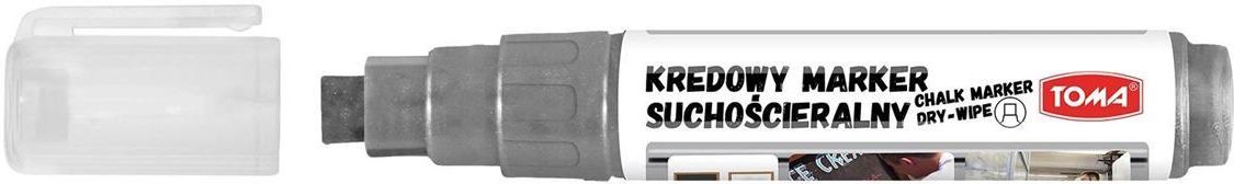 Marker kredowy suchościeralny 5-8mm Toma TO-295 srebrny marker z płynną kredą, do pisania po tablicach czarnych, białych, po szkle i powierzchniach plastikowych suchościeralny, do użytku wewnątrz pomieszczeń końcówka fibrowa bezwonny tusz pigmentowy nie zawiera xylenu końcówka ścięta 5 x 8 mm, tusz 8 g UWAGA: koniecznie przed pierwszym użyciem dokładnie wymieszaj (potrząsając) zawartość markera, następnie naciskając pompuj końcówkę, aż nasączy się kolorem. Dopiero wtedy marker jest gotowy do użycia. Produkt pochodzi z polskiej dystrybucji.
