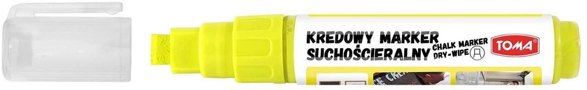 Marker kredowy suchościeralny 5-8mm Toma TO-295 żółty marker z płynną kredą, do pisania po tablicach czarnych, białych, po szkle i powierzchniach plastikowych suchościeralny, do użytku wewnątrz pomieszczeń nasączenie końcówki fibrowe bezwonny tusz pigmentowy nie zawiera xylenu końcówka ścięta 5 x 8 mm, tusz 8 g UWAGA: koniecznie przed pierwszym użyciem dokładnie wymieszaj (potrząsając) zawartość markera, następnie naciskając pompuj końcówkę, aż nasączy się kolorem. Dopiero wtedy marker jest gotowy do użycia. Produkt pochodzi z polskiej dystrybucji.