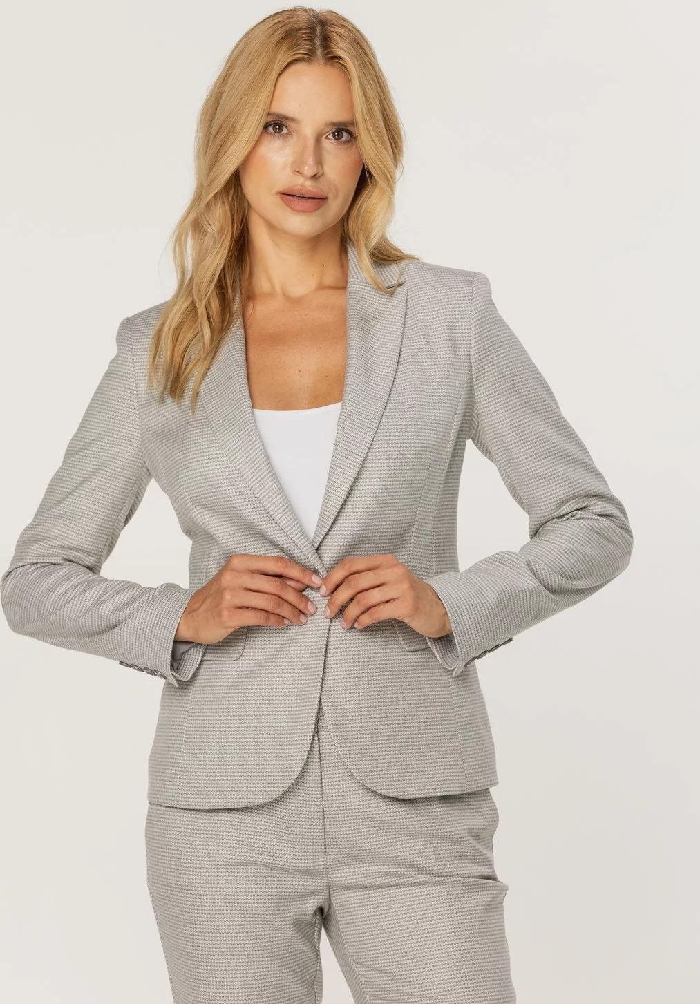 Elegancki garnitur damski to jeden z niezbędnych elementów kobiecej garderoby. Każda kobieta powinna mieć przynajmniej jeden taki zestaw w swojej szafie! Garnitury marki Willsoor są uniwersalne, ponieważ można je stylizować na wiele sposobów oraz zakładać na wiele okazji. Sama zdecyduj jaki LOOK dziś wybierzesz! ELEGANT LOOK – Garnitur, koszula, buty na obcasie CASUAL LOOK – Garnitur, bluzka , mokasyny SPORT LOOK – Garnitur, T-shirt, sneakersy Nasze garnitury uszyte są z materiałów, które nie są sztywne i niewygodne, a elastyczne i delikatne. Wybierając garnitur marki Willsoor bez wątpienia przekonasz się do noszenia go nie tylko od święta, ale również na co dzień! Garnitur jest lekki i wygodny, dzięki czemu nawet nie poczujesz, że masz na sobie tak niebywale elegancki strój! Jeśli jesteś wysoką kobietą, która boryka się z problemem zbyt krótkich rękawów i nogawek, zachęcamy do sprawdzenia naszej wyjątkowej kolekcji LONG SIZE! Marynarka damska Willsoor Tkanina: 33% wiskoza, 64% poliester, 3% elastan Skład podszewki: 94% poliester, 6% elastan Rodzaj marynarki: jednorzędowa, zapinana na jeden guzik Kolor główny: szara w delikatną pepitkę Producent: Willsoor Gwarancja: 24 m-ce Uszyta w Polsce Klasyczne spodnie garniturowe Tkanina: 33% wiskoza, 64% poliester, 3% elastan Kolor główny: szare w delikatną pepitkę Nogawki: zwężane Kieszenie: dwie boczne Producent: Willsoor Gwarancja: 24 m-ce Uszyte w Polsce