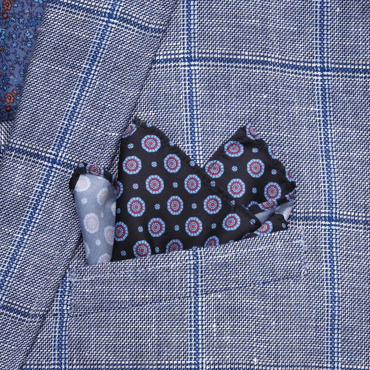 Poszetka Willsoor Poszetka jako ozdobna chusteczka wkładana do górnej kieszonki w garniturze stanowi idealne dopełnienie eleganckiego męskiego stroju. Jasna poszetka pasuje do ciemnego garnituru wizytowego, w ciągu dnia można stosować poszetki kolorowe w tonacji zbliżonej do koloru krawata. Wzorzyste poszetki należy wkładać wyłącznie do gładkiego krawata. Poszetka Willsoor opakowana jest w eleganckie pudełko widoczne na zdjęciu. - Tkanina: 100% microfibra - Kolor: ciemnogranatowa w błękitny i czerwony wzór - Wymiary: 23 cm x 23 cm po rozłożeniu - Uszyta w Polsce