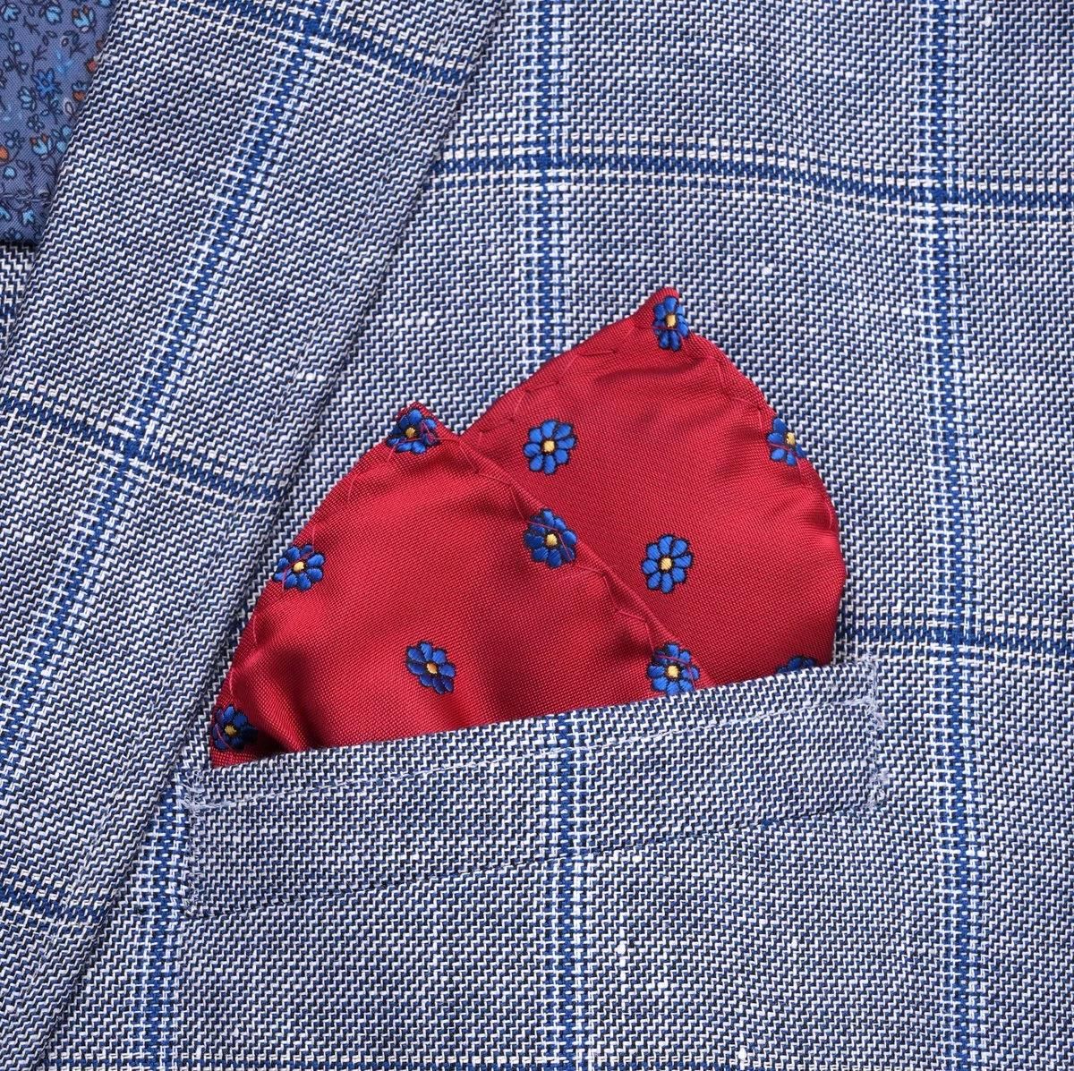 Poszetka Willsoor Poszetka jako ozdobna chusteczka wkładana do górnej kieszonki w garniturze stanowi idealne dopełnienie eleganckiego męskiego stroju. Jasna poszetka pasuje do ciemnego garnituru wizytowego, w ciągu dnia można stosować poszetki kolorowe w tonacji zbliżonej do koloru krawata. Wzorzyste poszetki należy wkładać wyłącznie do gładkiego krawata. Poszetka Willsoor opakowana jest w eleganckie pudełko widoczne na zdjęciu. - Tkanina: 100% microfibra - Kolor: czerwona w niebieskie kwiatki - Wymiary: 23 cm x 23 cm po rozłożeniu - Uszyta w Polsce