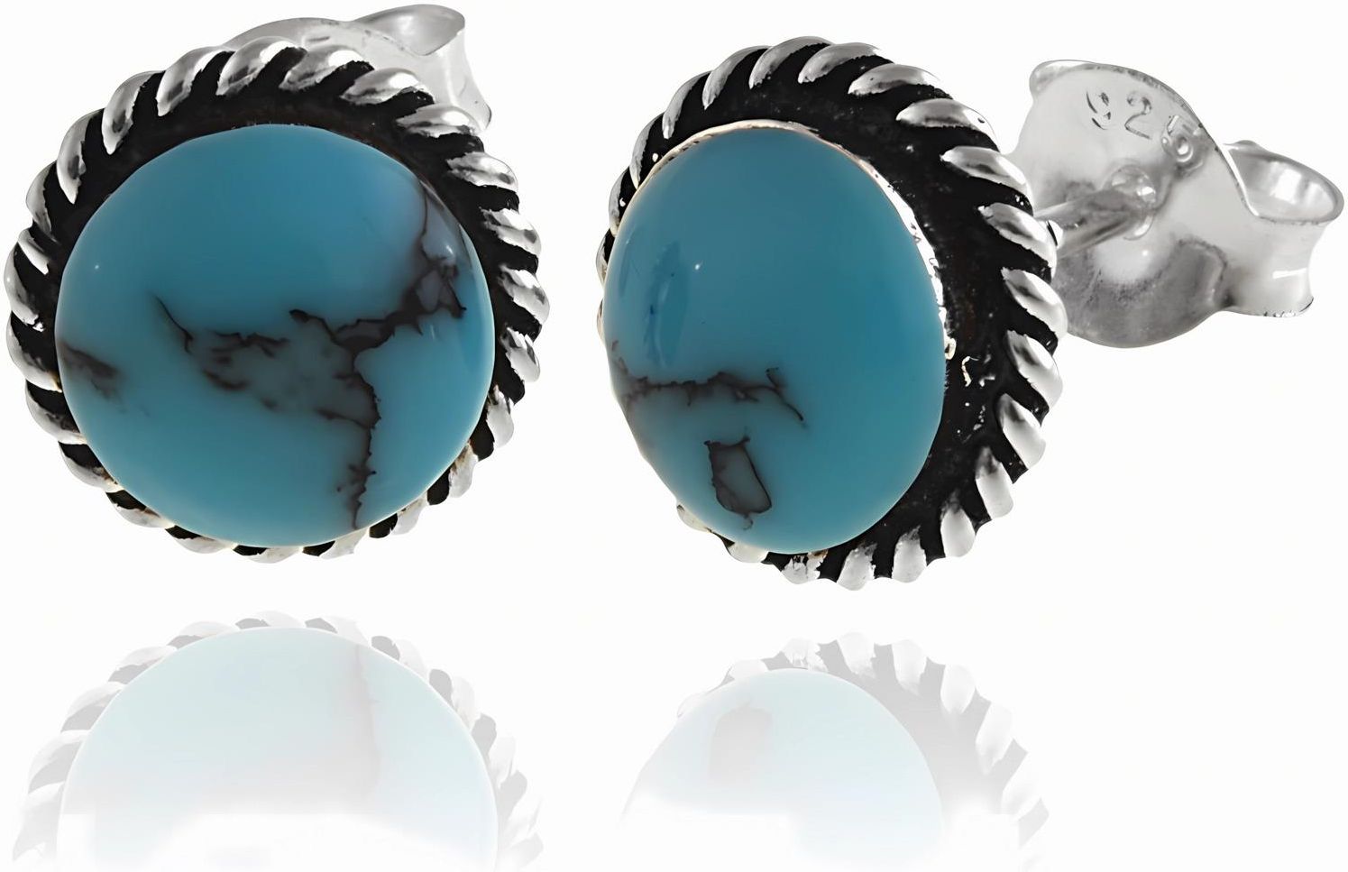 Delikatne wykonane z oksydowanego srebra kolczyki na sztyfcie o okrągłym kształcie, zdobionego turkusem otoczonym plecionym wzorem.