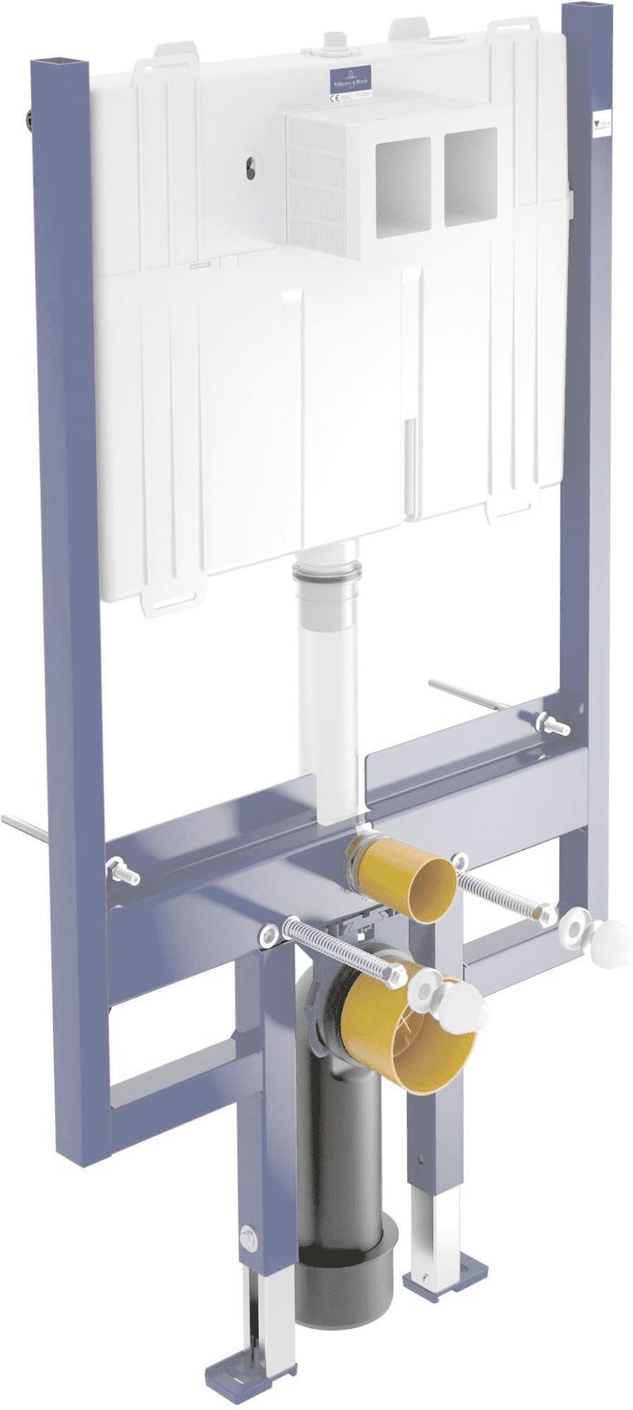Villeroy&Boch ViConnect Stelaż podtynkowy do WC 92247600 / 9224.76.00 do suchej (lekkiej) zabudowy, standardowa wysokość samonośna, malowana proszkowo rama ze stali, wstępnie zmontowana, mocowanie do ściany, nóżki i materiał mocujący, 2 pręty gwintowane M12 do zamocowań ceramiki z możliwością regulacji 180 mm, z osłoną i nakrętkami, instrukcja montażu, materiał mocujący, bez płytki uruchamiającej, do lekkiej zabudowy, do zabudowy przed masywną ścianą, do zabudowy w lekkich ścianach działowych, regulacja nóżek od surowej posadzki do górnej krawędzi gotowej posadzki w zakresie 0 - 200 mm, głębokości krawędzi przedniej: min. 90 mm ze spłuczką 80 mm, 6 punkty mocujące, izolowana spłuczka podtynkowa z systemem spłukiwania dwiema ilościami wody 3/6 l , lub 3/ 4,5 l, maksymalna pojemność 7,5 l, z zaworem napełniającym z grupu armatur I, elastyczny wąż do zaworu napełniającego z funkcją ręcznego przykręcania, zestaw przyłączowy do zaworu narożnego R1/2, Osłona do otworu rewizyjnego, z możliwością skrócenia, z kolankiem przyłączeniowym WC z regulacją 90°DN (∅90) / z mufą DN 90 (∅90)/ DN 100 (∅100) z osłoną, zestaw do montażu WC DN90 (∅90)/ 180 mm komplet, symbol dopuszczenia spłuczek podtynkowych: grupa armatury I Wymiary: 118,5 x 66,5 x 9 cm Waga: 14,8 kg Cena dotyczy samego stelażu