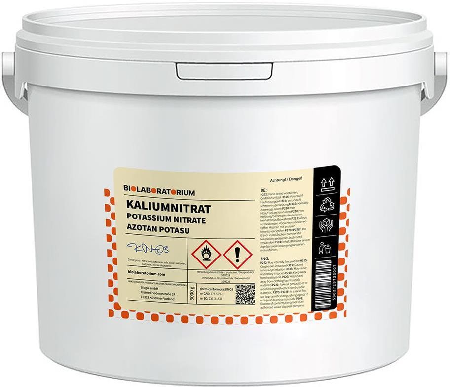 Azotan Potasu Saletra Potasowa E252 3000g BIOLABORATORIUM Azotan Potasu E252 5000g BIOLABORATORIUM Azotan potasu o wadze 5000g, marki BIOLABORATORIUM, to nieorganiczny związek chemiczny o różnorodnych zastosowaniach w przemyśle spożywczym i farmaceutycznym. W przemyśle spożywczym, azotan potasu (E252) jest używany jako konserwant, który pomaga w przedłużeniu trwałości żywności. Jest szczególnie popularny w produkcji wędlin, peklowanych mięs, serów, marynat, marynowanych warzyw i ryb. Azotan potasu może być również stosowany w przemyśle farmaceutycznym, gdzie jest używany jako składnik niektórych leków i suplementów diety. Ma właściwości przeciwbakteryjne i może być stosowany w leczeniu niektórych infekcji układu moczowego. Należy pamiętać, że azotan potasu jest substancją chemiczną i powinien być stosowany zgodnie z zaleceniami bezpieczeństwa. Przed użyciem należy zapoznać się z etykietą produktu i instrukcją obsługi. Należy zachować ostrożność i unikać spożycia w nadmiernych ilościach, zwłaszcza u osób wrażliwych na azotany. Czystość: Czysty SPOSÓB UŻYCIA Azotan potasu należy stosować zgodnie z zaleceniami producenta dotyczącymi bezpiecznego stosowania i dawkowania. Przed użyciem przeczytaj etykietę i instrukcję obsługi. PRZECHOWYWANIE Przechowywać w suchym i chłodnym miejscu, w szczelnie zamkniętym opakowaniu. Trzymać poza zasięgiem dzieci. Produkt nieprzebadany mikrobiologicznie. Producent: BioLaboratorium Kategoria: Drogeria Biogo/Odczynniki chemiczne/Odczynniki chemiczne biolaboratorium Waga z opakowaniem: 1 kg