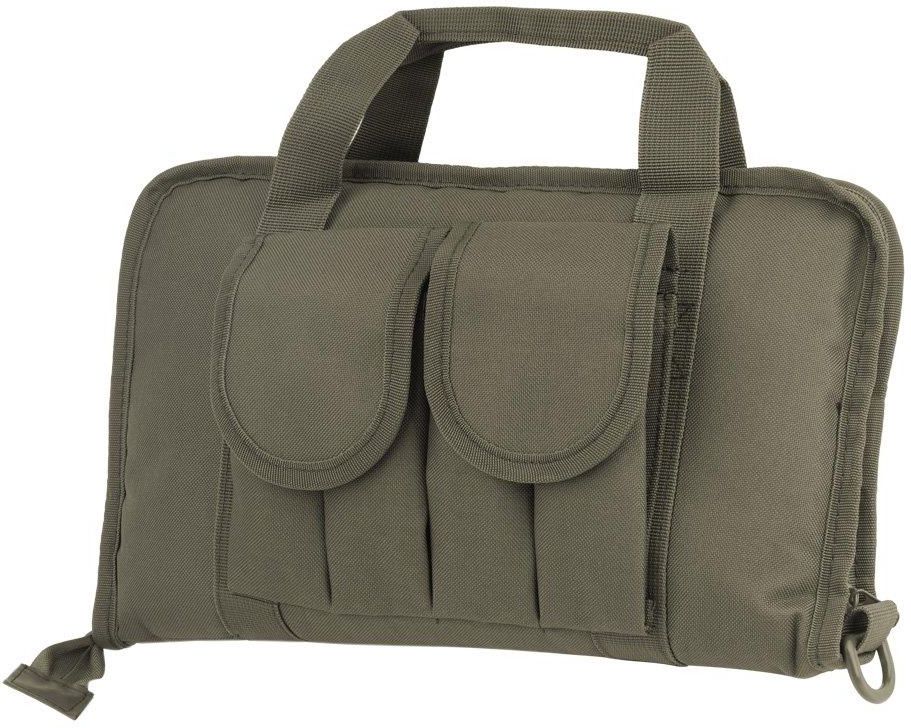 Double Pistol Case to torba służąca do przenoszenia dwóch pistoletów. Dodatkowo na zewnątrz umieszczono cztery ładownice na magazynki. Została zrobiona z Cordury. Wewnętrzna wyściółka została wykonana z grubej pianki, która zapewnia ochronę przenoszonemu wyposażeniu przed uszkodzeniami. Cechy: - Wykonana z nylonu - Solidny uchwyt transportowy - Główna komora otwierana długim zamkiem błyskawicznym - Możliwość rozłożenia pokrowca na płask i wykorzystania jako maty np. do czyszczenia- Wyściełane kieszenie na przenoszenie dwóch sztuki broni krótkiej - Dwie podwójne ładownice na magazynki pistoletowe - Wyściółka z miękkiej, nierysującej tkaniny - Przyszyta klamra w kształcie litery D, umożliwiająca zawieszenie pokrowca - Dodatkowa zewnętrzna kieszeń na dodatkowe akcesoria Dane techniczne: - Wymiary: 33 x 20 x 7 cm - Materiał: Nylon - Kolor: Zielony