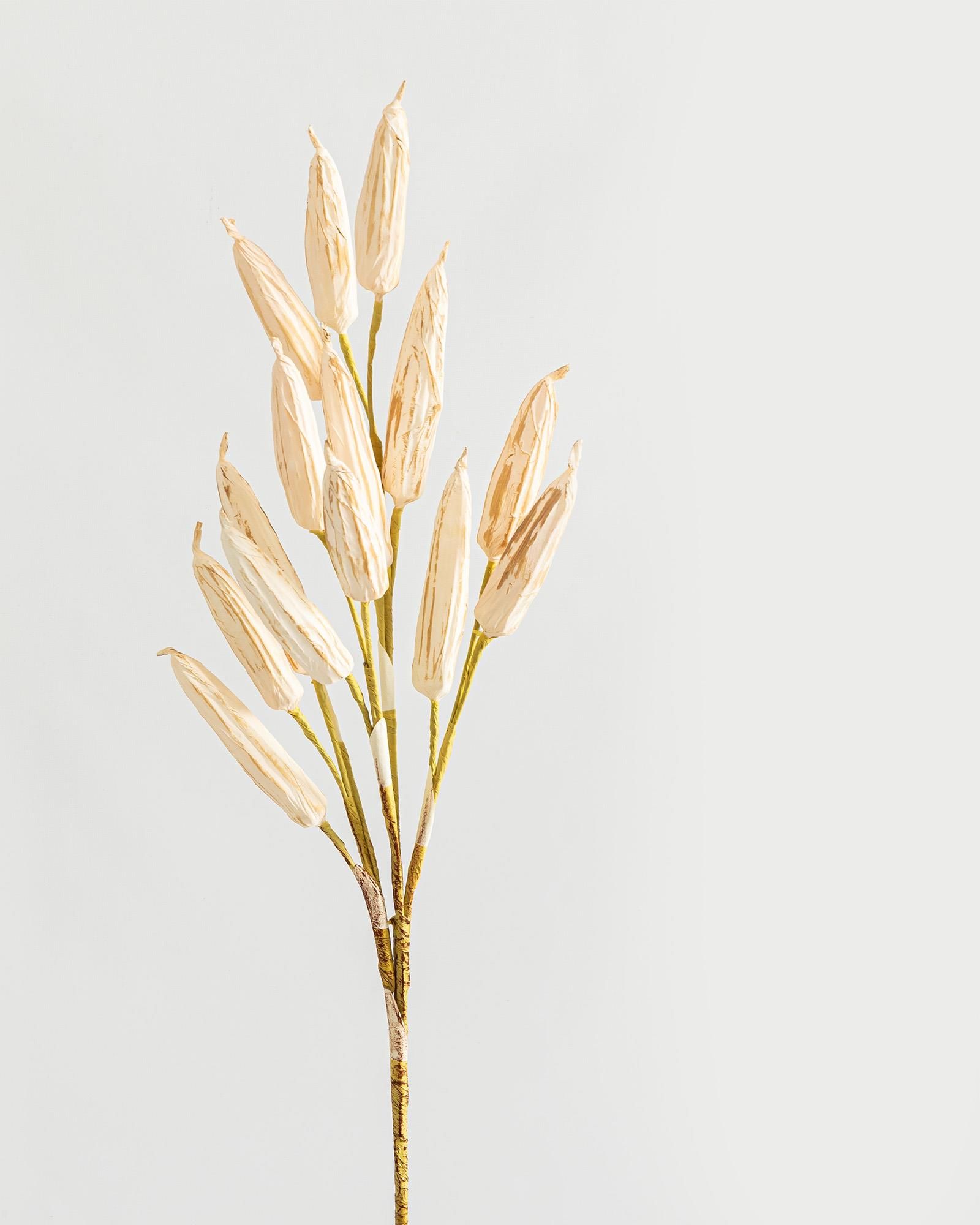 Sztuczną gałązkę o wysokości 95 cm włożysz do wysokiego wazonu. Uzupełnij wystrój salonu lub sypialni. Biała dekoracja wizualnie odświeży aranżację. Wyróżni się na tle ciemniejszych mebli. Zyskasz ozdobę, która zachowa na długo estetyczny wygląd.