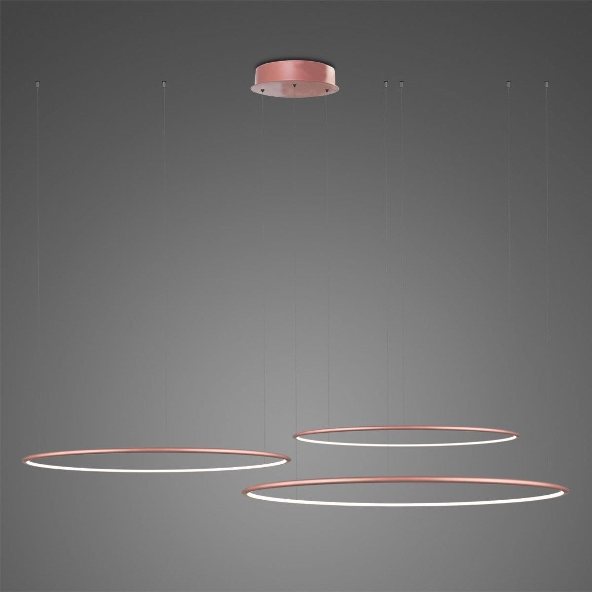 LEDowe Okręgi marki Altavola Design to lampa, z jednej strony zachwycająca prostotą formy jej geometrycznych abażurów, a z drugiej strony przewrotnie przykuwająca wzrok swym wyrafinowaniem. Ta ultranowoczesna lampa skrywa w sobie technologię SMD LED, co czyni z niej również oświetlenie energooszczędne. Delikatne aluminiowo-silikonowe okręgi świecą mocnym, bardzo przyjaznym naturalnym światłem. Oznacza to, że lampa świetnie sprawdzą się zarówno we wnętrzach mieszkalnych, jak i biurach oraz hotelach.Wszystkie lampy mają 3-letnią gwarancję producenta. Gwarantujemy serwis po gwarancyjny. Twoja przeglądarka nie wspiera tego formatu wideo.ALT - ikona produktu: ledowa lampa, led technology , światło do twojego domu , ciepłe światło, great idea, energooszczędna, lampa wisząca, nowoczesny design, led ideas, home decor, classy, ekskluzywna ledowa, home detail, led inspiration, czarne okręgi, ledowe ringi, led rings, domowe inspiracje, modern lamp, modern design, modna wisząca, lampa led, lighting ideas, led light, prestige interior, piękne oświetlenie, światło led, ekskluzywna, elegant interior, eleganckaALT - zdjęcia w galerii produktu: czarny ring, led inspiration , nowoczesna ledowa, nowoczesna lampa, ledowe oświetlenie, barwa dzienna, classy, luxury, modern design, elegancja w Twoim domu, home light, detail, decoration, home decore store, LED lamp , ledowa, ledowe okręgi, led rings, led ideas, led technology, led lights, lighting design, stylowe oświetlenie, modny wystrój, elegant interior, prestige w Twoim wnętrzu, wyszukany styl, stylowe lampySeria: Led shapeProducent: ALTAVOLA DESIGNMateriał: aluminium, SilikonTyp lampy: lampa wiszącaKolor: różowe złotoŚrednica abażuru: 80 cm, 60 cm, 40 cmWysokość całkowita: 120 cmŚrednica podsufitki: 26 cmŹródło światła: LED - zintegrowanyMoc źródła światła : 68WBarwa światła: barwa dziennaCCT: 4000KStrumień świetlny: 4700 lmIlość źródeł światła: 3Regulowana wysokość zawieszenia: takMożliwość ściemniania: takNapięcie robocze / sieciowe: 230V / 230VStopień ochrony: IP 44Klasa ochrony: IIKlasa efektywności energetycznej: AKompatybilna z typem ściemniacza: Triak