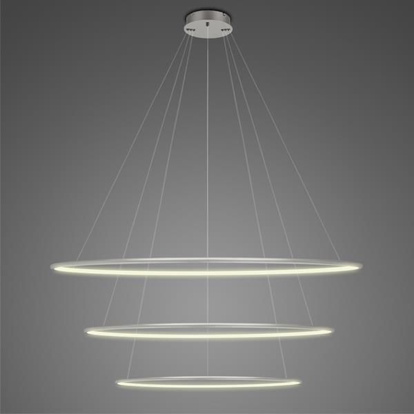 LAMPA WISZĄCA LEDOWA ELEGANCKA NOWOCZESNA MODNA DO SALONU JADALNI DŁUGA LEDowe Okręgi marki Altavola Design to lampa, z jednej strony zachwycająca prostotą formy jej geometrycznych abażurów, a z drugiej strony przewrotnie przykuwająca wzrok swym wyrafinowaniem. Ta ultranowoczesna lampa skrywa w sobie technologię SMD LED, co czyni z niej również oświetlenie energooszczędne. Delikatne aluminiowo-silikonowe okręgi świecą mocnym, bardzo przyjaznym naturalnym światłem. Oznacza to, że lampa świetnie sprawdzą się zarówno we wnętrzach mieszkalnych, jak i biurach oraz hotelach.Wszystkie lampy mają 3-letnią gwarancję producenta. Gwarantujemy serwis po gwarancyjny. Twoja przeglądarka nie wspiera tego formatu wideo.Seria: Led shapeProducent: ALTAVOLA DESIGNMateriał: aluminium, SilikonTyp lampy: lampa wiszącaKolor: srebrnyŹródło światła: LED - zintegrowanyKierunek padania światła: do wewnątrzŚrednica abażuru: 60 cm, 80 cm, 100 cmWysokość całkowita: 120 cmRegulowana wysokość zawieszenia: takMoc źródła światła : 91WBarwa światła: barwa dziennaNapięcie robocze / sieciowe: 230V / 230VIlość źródeł światła: 3Stopień ochrony: IP 44Klasa ochrony: IIKlasa efektywności energetycznej: ACCT: 3000KStrumień świetlny: 5460 lmMożliwość ściemniania: nieGrubość abażuru: 1,8 cm