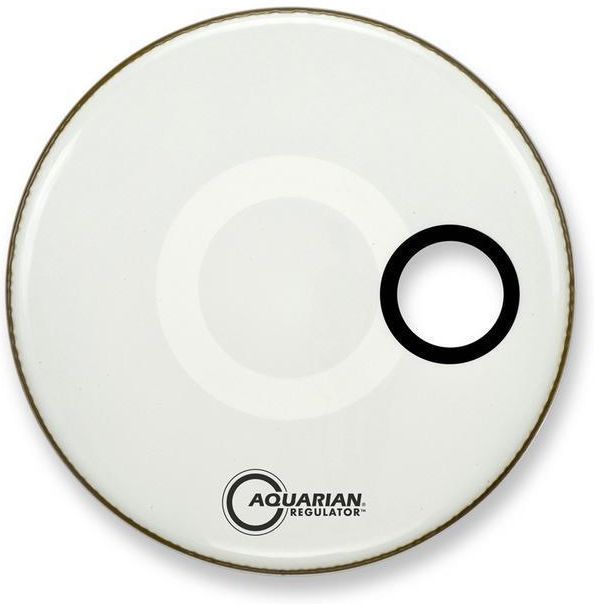 Aquarian - Regulator z otworem RSM 22 White Aquarian Biały, pojedynczy naciąg rezonansowy, wyposażony we "Floating Muffling System" - wbudowany od wewnątrz pierścień tłumiący, idealnie współgrający z serią Super Kick Naciąg posiada wycięty otwór rezonansowy 4 3/4" z czarną otoczką, zabezpieczony przed uszkodzeniami specjalnym tworzywem, został wyprodukowany z materiału eliminującego płaskie i plastikowe brzmienie na rzecz pełnego i otwartego soundu rezonansu. Rozmiar: 22" waga opakowania: 2