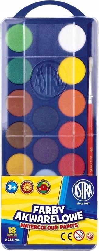 Farby akwarelowe fi 23.5mm 18 kolorów ASTRA ASTRA papiernicze ✅ ✔️ Farby akwarelowe to farby wodne służące do malowania na papierze. Mają one postać suchych guziczków, z których po zwilżeniu wodą niemal natychmiast uzyskuje się gotowe do użycia farby. Akwarele szkolne ASTRY składają się z wysokiej …