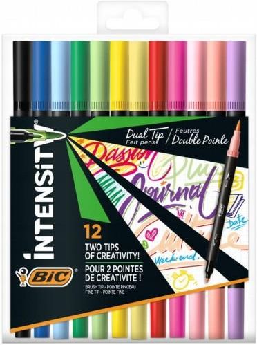 Pisaki dwustronne pędzelkowe 12szt Intensity Dual Tip Classic + Pastel BIC pisaki BIC Intensity Dual Tip to narzędzie 2 w 1: cienki pisak na jednym końcu i mazak pędzelkowy na drugim, elastyczna końcówka pędzelkowa jest idealna do kreatywnego pisania, kolorowania dla dorosłych, dzienników i prac …