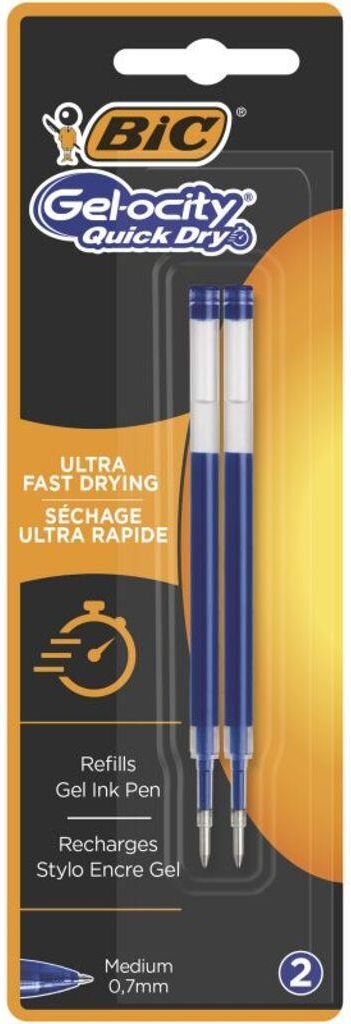 BIC Gel-ocity Quick Dry Wkład niebieski Blister 2szt - Automatyczny długopis żelowy o średniej grubości końcówce, niebieski - Wyjątkowo szybkoschnący tusz – nie rozmazuje się - Gładkość pisania - W pełni gumowana obudowa dla większego komfortu pisania - Średnica końcówki 0,7 mm zapewnia szerokość linii pisania 0,3 mm