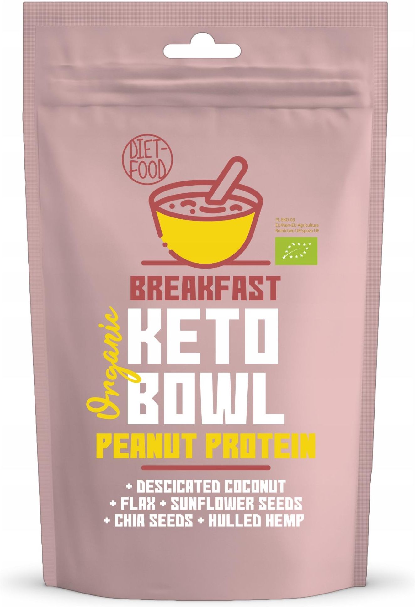 Śniadaniowy Peanut Protein Keto Bowl - 200g - Diet-Food Śniadaniowy Keto Bowl Peanut Protein - 200g - Diet-Food Zamiennik zwykłej owsianki, bądź musli o smaku kokosowym, przystosowany dla osób przebywających na diecie ketogenicznej i low-carb! Teraz możesz przygotować szybkie i pyszne śniadanie zaledwie w pare minut. Został wzbogacony o witaminy oraz minerały, dzięki czemu poza świetnym smakiem, jest również zdrową keto przekąską. Warunki przechowywania: W szczelnie zamkniętym opakowaniu po kazdym użyciu. W suchym. ciemnym i chłodnym miejscu. Marka: Diet Food sklad produktu:Skład: bio chipsy kokosowe, bio siemie lniane mielone, bio mąka z orzechów ziemnych 16%, bio nasiona chia, bio erytrytol, bio łuskane nasiona konopi, bio ziarna słonecznika, bio cynamon, sól, bio aronia, bio baobab. wartosci odzywcze: Wartości odżywcze:w 100gWartości energetyczne:1542 kJ /368 kcalTłuszcze24 g- w tym kwasy tłuszczowe nasycone12 gWęglowodany20 g- w tym cukry4 gBiałko22 gBłonnik44 gSól2 g jak stosowac:Diet-Food Keto Bowl to świetny produkt śniadaniowy, polej go ulubionym mlekiem, jogurtem lub dowolnym sokiem owocowym. Seria Keto Bowl bazuje wyłącznie na ekologicznych składnikach. Produkty od Diet-Food zostały wzbogacone o witaminy i minerały, dzięki czemu oprócz świetnego smaku są zdrową alternatywą dla chipsów i innych niezdrowych przekąsek. Dostarczają porannej energii tak niezbędnej do codziennego prawidłowego funkcjonowania organizmu.