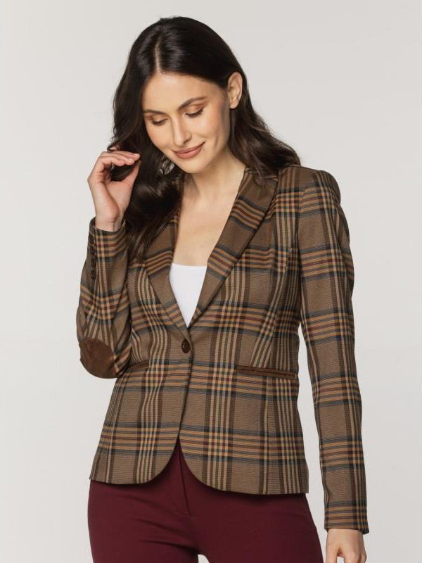 Brązowa marynarka damska w kratę z brązowymi kontrastami i nałokietnikami, zapinana na jeden guzik