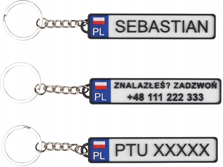 Brelok do kluczy - personalizowana tablica rejestracyjna z Twoim imieniem lub Twoją rejestracją lub nazwą firmy i numerem telefonu. Spersonalizowany brelok do kluczy w formie tablicy rejestracyjnej dzięki czemu w łatwy sposób można dokonać identyfikacji każdego pojazdu. Dodatkowo brelok można wykorzystać jako prezent z indywidualnym napisem np. imię, ksywa, model samochodu lub marka. Cechy produktu Materiał: wytrzymały PLA (najwyższej jakości filament z certyfikatami) Waga: 5 gramów Wymiary: 7cm (długość) x 1,3cm (szerokość) x 0,25cm (grubość) Kolory: biały, czarny, czerwony, niebieski Technologia: druk FDM (3D) na półprzemysłowych drukarkach z dokładnością do 0,08mm Cena podana w aukcji dotyczy jednej sztuki breloka z metalową zawieszką ✅ Wszystkie zdjęcia przedstawiają realne produkty. Nie są to rendery. OPCJA NUMER 1 [IMIĘ / KSYWKA] 1 rząd: Wybierz swoje imię lub ksywkę. Maksymalnie 12 znaków. OPCJA NUMER 2 [TABLICA REJESTRACYJNA] 1 rząd: Wybierz swoją tablicę rejestracyjną. Maksymalnie 12 znaków. OPCJA NUMER 3 [GADŻET FIRMOWY] 1 rząd: Wybierz nazwę firmy lub inny dowolny napis. Maksymalnie 17 znaków. 2 rząd: Wybierz numer telefonu OPCJA NUMER 4 [BEZPIECZNY BRELOK] 1 rząd: Napis - Znalazłeś? Zadzwoń 2 rząd: Wybierz numer telefonu
