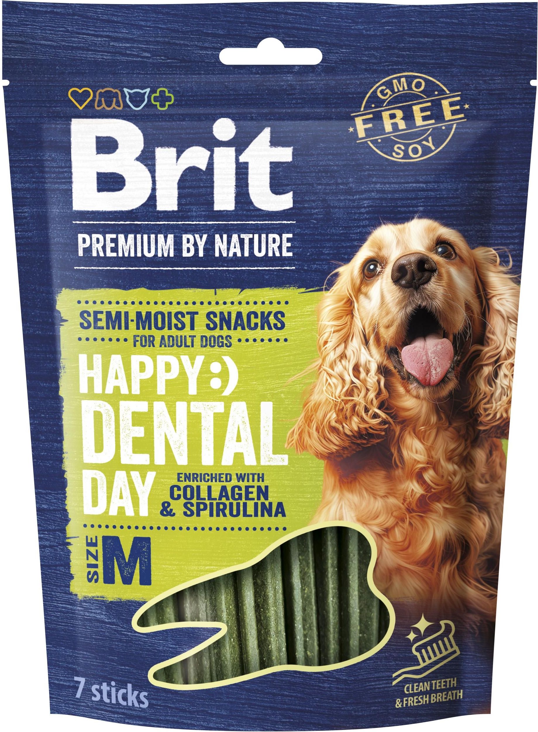 Brit Premium by Nature Semi-moist Snacks Dental Stick with Collagen & Spirulina M Półmiekki przysmak do pielęgnacji zębów, patyczki dentystyczne z kolagenem i  spiruliną.  Karma uzupełniająca dla psów. Smakołyki w postaci pałeczek dentystycznych, które łączą  w sobie działanie kilku kluczowych substancji: - kolagenu, wspierającego zdrowie i mobilność stawów,  ale także przyczyniającego się do redukcji płytki nazębnej i kamienia nazębnego, - spiruliny, która dzięki swoim właściwościom  antybakteryjnym pomaga zatrzymać rozwój  szkodliwych bakterii w jamie ustnej, przyczyniając się do dbałości o świeży oddech i czystsze  zęby, - SHMP, pomagającego utrzymać czystsze zęby  i zmniejszającego powstawanie kamienia nazębnego, będącego jedną z głównych przyczyn  powstawania próchnicy. INSTRUKCJA DOTYCZĄCA KARMIENIA: Podawać codziennie jako przysmak lub nagrodę. Należy zapewnić psu  stały dostęp do miski świeżej wody. Nie jest to karma pełnoporcjowa. Przestrzegaj zalecanej dziennej dawki.  Przechowywać w suchym i chłodnym miejscu, z dala od bezpośredniego działania promieni słonecznych. Po  otwarciu ponownie szczelnie zamknąć, aby zachować świeżość.  Energia metaboliczna 2970 kcal/kg Skład mąka pszenna (73%), gliceryna roślinna (12%), hydrolizowana wątroba  z kurczaka (5%), lignoceluloza (3%), melasa (2,5%), kolagen (2%), spirulina  (2%), heksametafosforansodu (0,5%). Składniki analityczne białko surowe 11,0%, tłuszcz surowy 2,0%, włókno surowe 3,0%, popiół surowy  2,5%, wilgotność 17,0%, wapń 0,2%, fosfor 0,3%, sód 0,2%. DODATKI DIETETYCZNE W 1KG: witamina C (3a312) 35 mg.  Zawiera konserwanty zatwierdzone w UE: kwas cytrynowy (1a330), kwas DL-jabłkowy (1a296). Profilaktyka przez żywienie - to główna zasada, którą spełniają starannie skomponowane karmy Brit Care. Wiemy, że zwierzęta domowe są w równym stopniu jak my sami narażone na stres i poważne choroby, dlatego z miłości do nich opracowaliśmy unikalną recepturę, opartą na wyselekcjonowanych składnikach. Wierzymy, że odpowiednia dieta ma ogromne znaczenie dla zdrowia i kondycji naszych czworonożnych przyjaciół. Stąd w karmach Brit znajdziecie tylko to, co najlepsze: wysokiej jakości mięso, ryby, warzywa i owoce, zioła oraz składniki funkcjonalne.