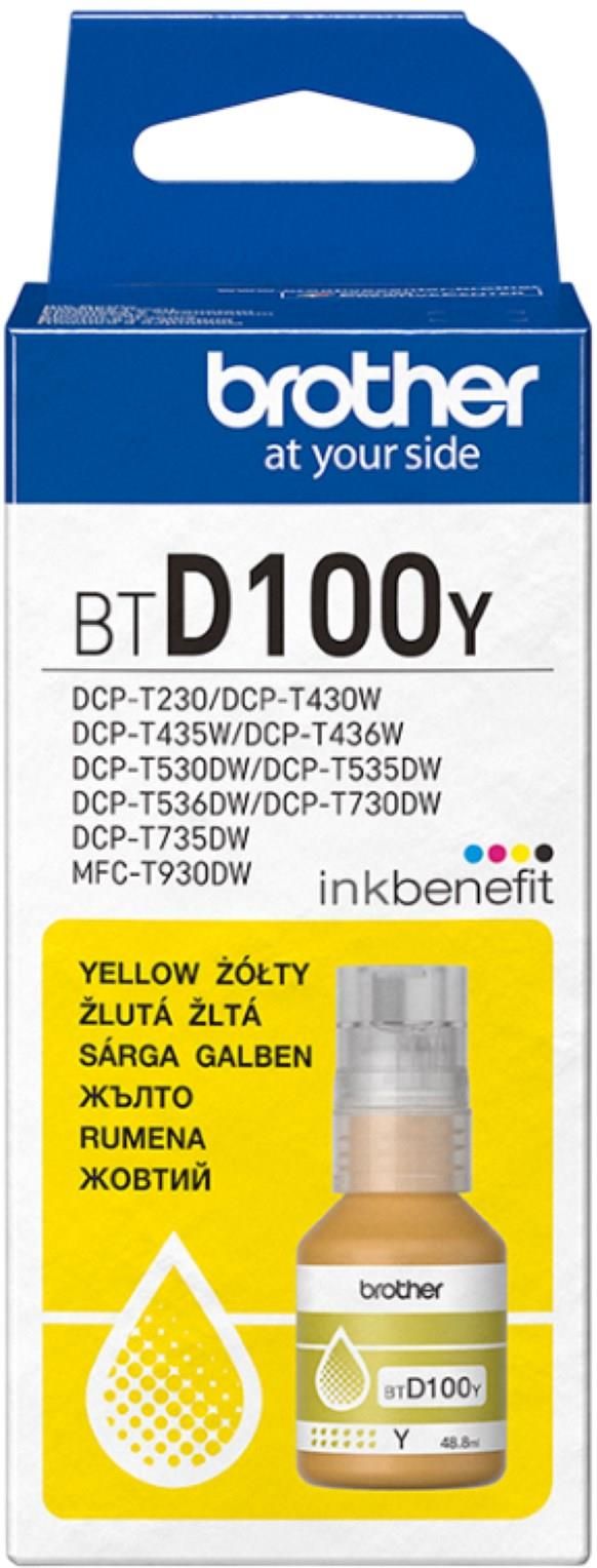 Brother BT-D100Y Pozwala na druk do 5000 stron Kompatybilny z wybranymi urządzeniami firmy Brother Poddany rygorystycznym testom w celu zapewnienia niezawodności Używanie oryginalnego tuszu firmy Brother pozwala na zachowanie gwarancji Wysokiej jakości materiały eksploatacyjne firmy Brother Opis produktu  Brother BTD100Y Oryginalny tusz w kolorze żółtym BTD100Y został opracowany, aby zapewnić wysoką jakość drukowanych dokumentów, a wydajność butelki do 5000 stron, pozwala na rzadsze uzupełnianie pojemników na tusz. Napełnij zbiornik i ciesz się trwałymi wydrukami najwyższej jakości. Kompatybilne z Brother DCP-T430W, DCP-T435W, DCP-T436W, DCP-T530DW, DCP-T535DW, DCP-T536DW, DCP-T730DW, DCP-T735DW, MFC-T930DW. Więcej informacji o produkcie Brother BTD100Y Tusz  BTD100Y  firmy Brother w kolorze żółtym,  został zaprojektowany, aby zapewnić wysokiej  jakości wydruki za każdym razem. Kupowanie tańszych zamienników wydaje się kuszące, należy jednak pamiętać, że wpływają one nie tylko na jakość wydruków, ale również na ważność gwarancji oraz możliwe długotrwałe uszkodzenie drukarki. Oryginalny tusz BTD100Y   firmy Brother, sprawi, że twoja drukarka będzie działała prawidłowo, wykorzystując pełnię swoich możliwości.