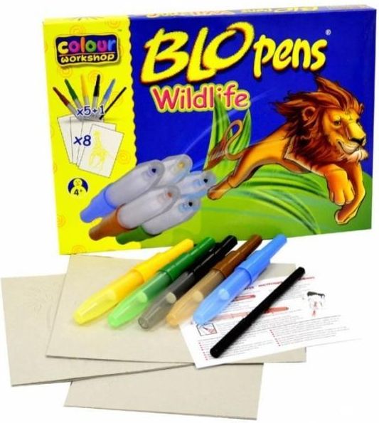 Uwaga! Mazaki występują w dwóch zestawach: Wildlife i Dinosaur, wysyłane według dostępności- brak możliwości wyboru. Zestaw mazaków dmuchanych BLOpens do stosowania na papierze. Opakowanie zawiera 5 kolorów oraz 1 czarny mazak do kolorowania oraz 8 różnych szablonów, 10 arkuszy papieru A4. Tusz na bazie wody jest zmywalny i nieszkodliwy dla zdrowia. Czy są dmuchane flamastry? Dmuchane flamastry to specjalne markery aerograficzne, które pozwalają na stworzenie cudownych prac. Specjalny tusz w nich zawarty, po dmuchnięciu w marker, pozostawia kolorową mgiełkę na papierze. Stosując połączenia różnych kolorów można tworzyć przepiękne gradientowe połączenia. Markery to źródło niekończącej się zabawy! Świetne zestawienia kolorystyczne. Oryginalne szablony w połączeniu z własnymi pomysłami gwarantują doskonałą zabawę. Jak działają markery? Umieść flamaster w specjalnej plastikowej nasadce, tak by końcówka z farbą znajdowała się przy dolnym otworze nasadki. Na górze nasadki nałóż ustnik. Dmuchaj w ustnik. Obserwuj jak kolorowa mgiełka osiada na kartce dając świetny efekt. Po zakończeniu pracy zostaw markera w pozycji wyjściowej. Farba nakłada się równomiernie, odcienie nie mieszają się, a tusz od razu wysycha i nie rozmazuje się.