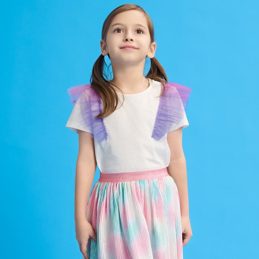 T-shirt dla dziewczynki Materiał i technologie: 100% bawełna (gramatura 160 g/m2) drugi materiał - 100% poliester certyfikat Oeko-Tex Standard 100 Pranie i pielęgnacja: Prać w temperaturze do 30 °C, proces łagodny. Nie bielić. Nie suszyć w suszarce bębnowej. Prasować w temperaturze do 110 °C. Nie czyścić chemicznie. Prać i prasować po lewej stronie. Nie prasować ozdób. Prać z podobnymi kolora..