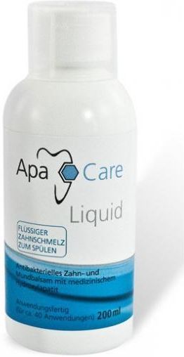 Wskazania: ApaCare Liquid jest balsamem dla zębów i ust. Z płynnego szkliwa w czasie płukania powstaje na zębach warstwa ochronna. Rysy i pory zostają uszczelnione, a ilość bakterii w jamie ustnej znacznie zmniejszona. Sposób użycia: Jamę ustną dokładnie płukać 2 razy dziennie pomiędzy posiłkami lub po spożyciu napojów zawierających kwasy. Do płukania należy stosować 5ml rozcieńczonego płynu, płukać należy przez 30 sekund. Przeznaczony jest dla dorosłych i dzieci od trzeciego roku życia. Opakowanie: 200ml