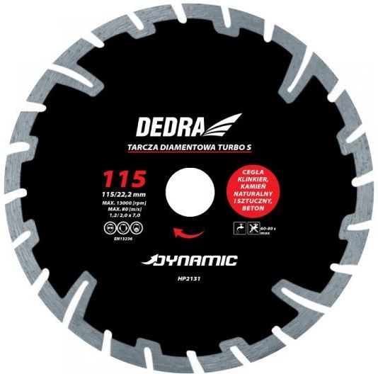 Tarcza diamentowa DYNAMIC TURBO S do cięcia betonu, cegły, klinkieru, kamienia, twardej ceramiki Średnica tarczy - 125 Średnica otworu mocującego - 22,2mm Nr katalogowy - HP2132 Producent - DEDRA Tarcza diamentowa TURBO S. Tarcza przeznaczona do cięcia betonu, cegły, klinkieru, kamienia, twardej ceramiki Możliwość cięcia na sucho i mokro. (w aukcji zdjęcie poglądowe tarczy rozmiar 115mm) DEDRA profesjonalna jakość za przystępną cenę. Tak w skrócie można określić urządzenia oferowane przez POLSKIEGO producenta, firmę DEDRA. Produkty tej marki charakteryzują się bardzo dobrymi parametrami, wysoką jakością wykonania oraz niezawodnością. POLSKA firma działająca od 1991 roku! [Kod produktu: 97e8aIFpcrIhUDWB2CA4vA==]