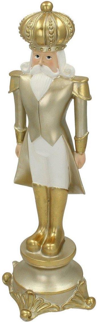 Dziadek do orzechów w złotym kolorze. Wprowadź świąteczny klimat do Twojego domu. Figurka Dziadka do orzechów to uroczy i tradycyjny element dekoracyjny. Ta klasyczna postać to nieodłączny elementem świątecznej tradycji, która stanowi symbol magii i cudu świąt Bożego Narodzenia.Pięknie wykonana, przedstawia Dziadka do orzechów w całej swojej okazałości. Jego ubranie w złotym kolorze, biała długa broda i złota korona, dodają mu wyjątkowego uroku. Figurka jest starannie pomalowana, a jej szczegóły wyróżniają się, tworząc wrażenie, że Dziadek do orzechów ożywa kiedy odwrócimy wzrok. Figurka dodaje ciepła i magii wnętrzu i podkreśla ducha świąt. To wspaniały pomysł na dekorację stołu świątecznego, kominkową półkę lub prezent. Dekoracje świąteczne najlepiej prezentują się w duecie! Sprawdź nasze inne propozycje ozdób na święta! Wymiary: szer. 15 cm, gł. 15 cm, wys. 42 cm.Materiał: poliresin.
