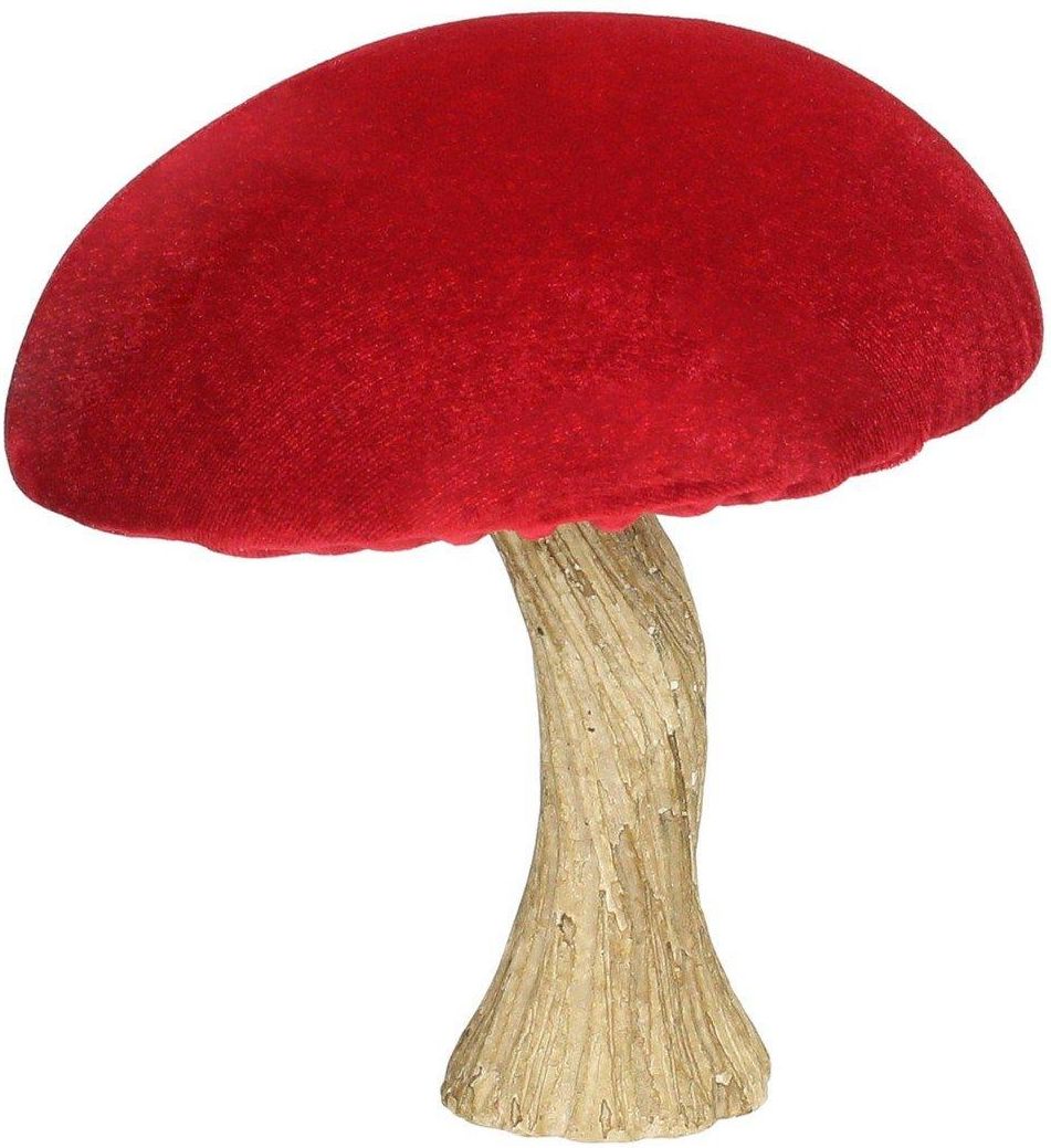 Figurka czerwonego grzybka z welwetowym kapeluszem. Figurka grzybka z miękkim, welwetowym kapeluszem w kolorze intensywnej czerwieni. Ta oryginalna dekoracja przepięknie uzupełni wystrój wnętrza, nadając mu wyjątkowego charakteru. Doskonale sprawdzi się w salonie, sypialni czy pokoju dziecka. Figurka grzybka efektownie zaprezentuje się w towarzystwie innych dekoracji z leśnym motywem. Skompletuj ją z mniejszą figurką tej samej serii. Wymiary: śr. 16 cm, wys. 17 cm.