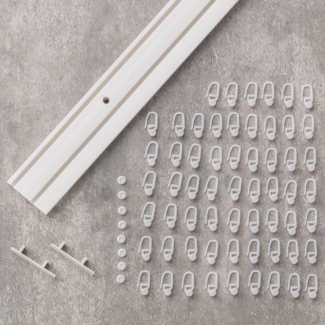 Kompletna szyna sufitowa podwójna prosta 210cm. Stanowi alternatywę dla tradycyjnych karniszy, szczególnie polecana tam gdzie odległość od okna do sufitu nie pozwala zamontować karnisza.W zestawie nie występuje blokada do firan/ zasłon. Na życzenie klienta bezpłatnie wykonujemy otwór umożliwiający założenie blokady- w tym celu prosimy o kontakt z biurem obsługi klienta. (Uwaga! Po wykonaniu tej usługi produkt nie podlega zwrotowi) Komplet zawiera: szyna podwójna prosta o wym. 210cm - 1 szt. dekiel zakończeniowy - 2 szt.zaślepka - 8 szt. agrafki - 60 szt. Montaż za pomocą wkrętów (brak w zestawie). Szyny można łączyć ze sobą za pomocą specjalnego łącznika do szyny. Do podójnej szyny są potrzebne dwa łączniki.Wymiar: dł. 210cm, gł. 5,8cm, wys. 1,3cm. Materiał: tworzywo PCV. Kolor: biało-szary.
