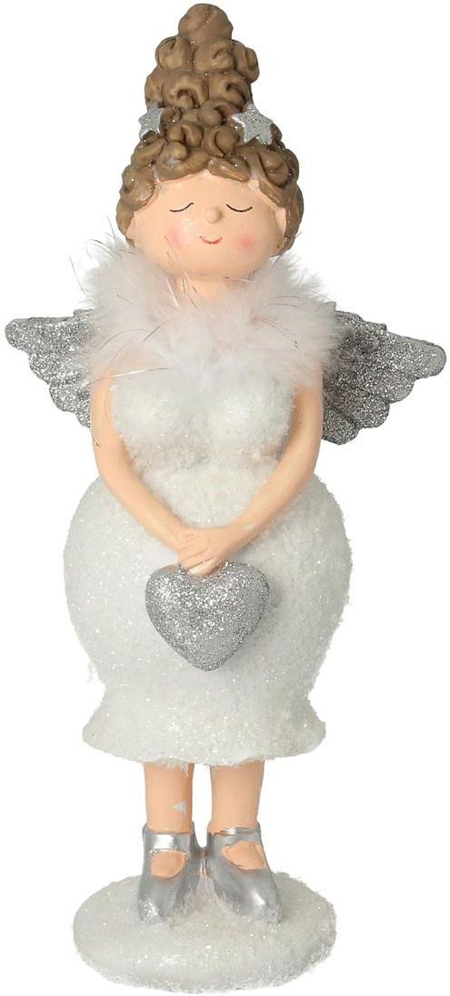 Biała figurka anioła ze srebrnymi skrzydłami i sercem w dłoni. Ten uroczy aniołek w białej sukience to doskonały wybór, jeśli chcesz dodać swojemu wnętrzu odrobinę magii i uroku. Srebrne elementy pięknie połyskują, a subtelne piórka na kołnierzu dodają mu lekkości. Dekoracja idealna na kominek, stół lub półkę, by stworzyć świąteczną atmosferę pełną ciepła. Wprowadź do swojego domu anielską postać, która będzie przypominać o radosnych chwilach świąt. Wymiary: szer. 14 cm, dł. 11 cm, wys. 30 cm.Materiał: polyresin.